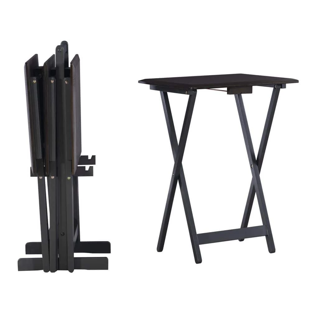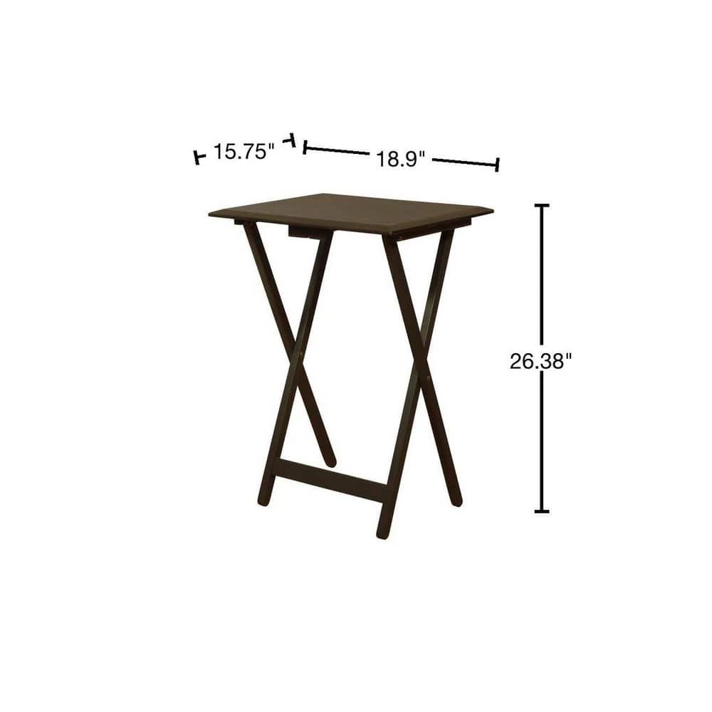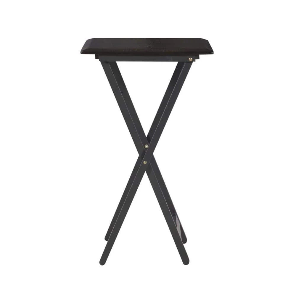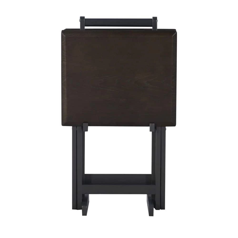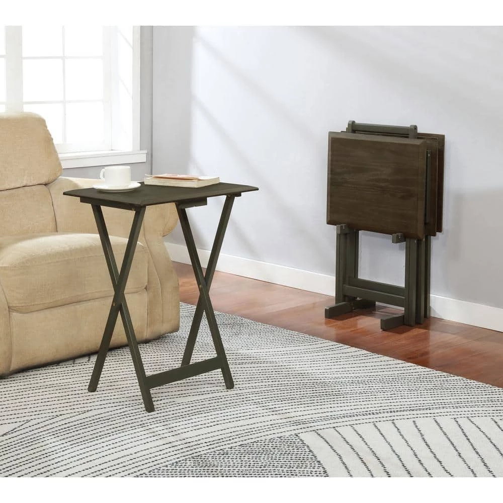 Perfect for small spaces, the winnie grey snack tray set is a classic home furnishings staple. The grey washed oak veneer tray tops offer a classic look that fits easily into any decor. Perfect for entertaining or working in your favorite chair, these trays fold up easily and store away quickly. The handle on the top of the stand makes it easy to transport the set from one room to another. Set includes four tray tables and one stand.
