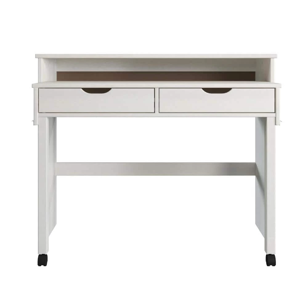 Make the most of your space with this innovative McLeod 42 in. Rectangular White 2-Drawer Extendable Console Desk with Casters. Place a monitor on top and use the pullout extension as a desktop that can be quickly stowed when work is done. Two roomy drawers provide ample storage for supplies. The unique two level table design provides a creative space for displaying photos and art in your entryway, hall or living room. A timeless white stained finish and contemporary minimalist style make this solid wood desk the perfect addition to your home office, living room, entryway or bedroom decor.