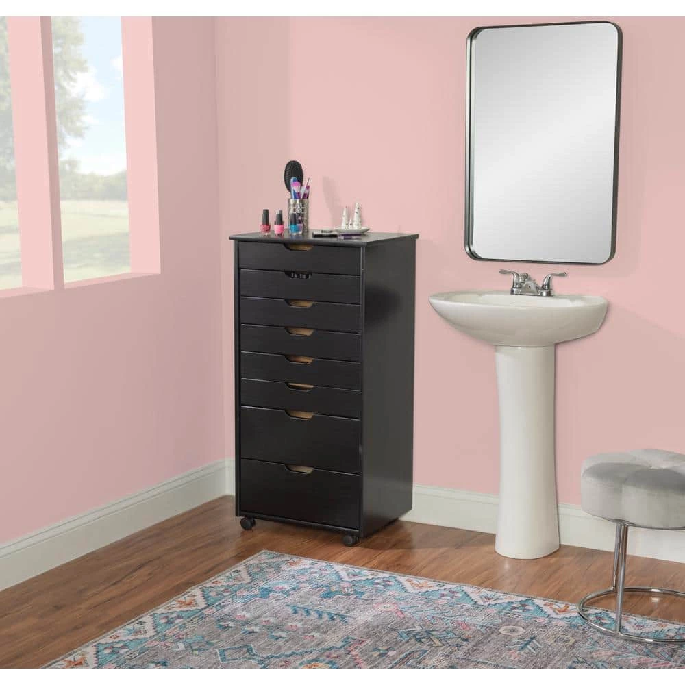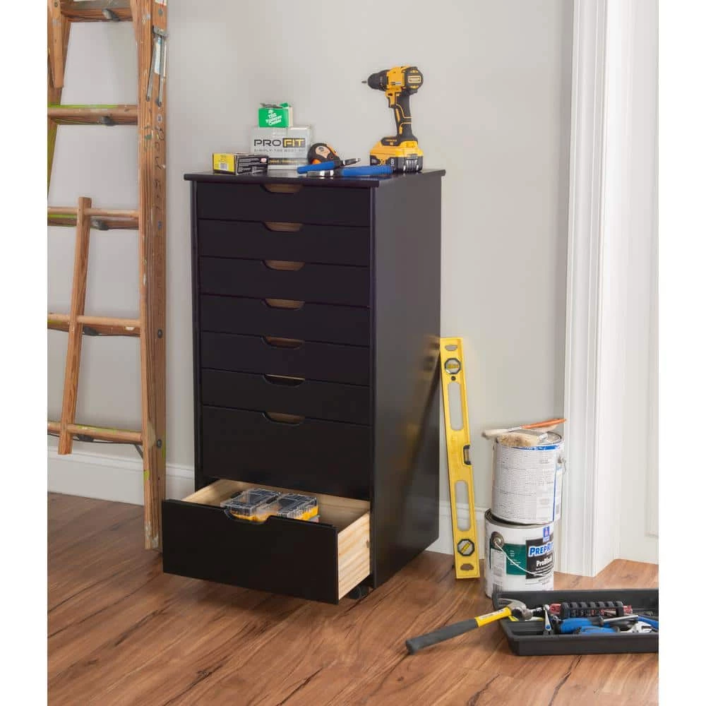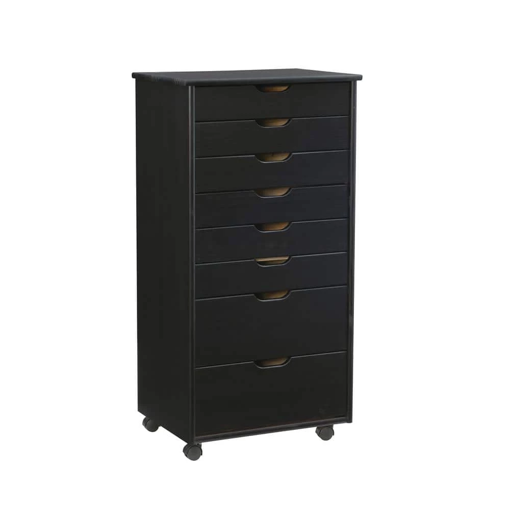 This McLeod Black Eight Drawer Rolling Storage Cart is a versatile storage solution for Office, Kitchen, Bedroom or anywhere where organization is needed. Solidly constructed from Pine wood and finished in a handsome black. Six equal size and two deep drawers are finished off with an ample top that can go next to a desk or craft table to put items within reach. Soft contoured handle cut outs are easy on the touch and create a clean, modern look. Drawers can be easily removed and used as a tray to transport your items to your workspace. Casters make this piece mobile to go into any room easily.