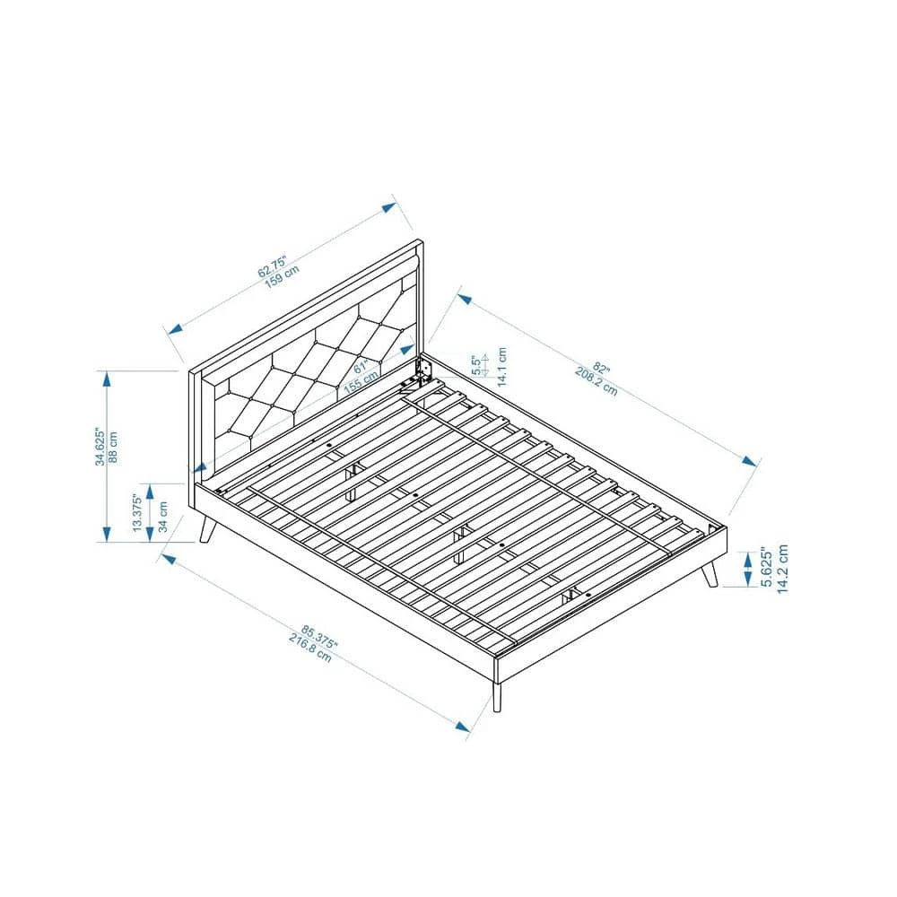 The streamlined design of the Mid Century Upholstered Platform Queen Bed will create a stunning focal point in your space. The clean lines, angled legs and walnut finish combine to form a signature look to this classic-piece. The headboard is accented with button tufted grey fabric. Bed includes headboard, foot board and side rails.