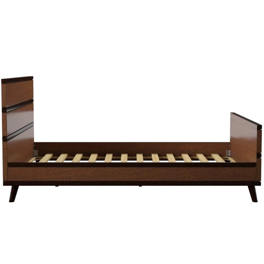 Clean lines and angled legs combine to form the Mid-Century Platform Queen Bed. The walnut finished streamlined frame is accented with dark striped details. Bed includes headboard, footboard and side rails.