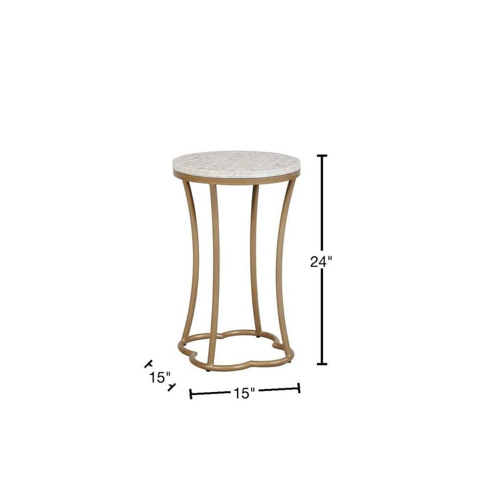 This Mina 15″ Gold 24″H Round Capiz Shell Accent End Table blends subtle shapes and curves with a coastal flare. Adds a splash of accent in event the smallest of spaces. Featuring a gold bent tube frame and neutral capiz shell finish on the table top, this unique piece will serve as a beautiful accent in nearly any decor. This round table is perfect for displaying small decor items such as candles, vases, and pictures frames.