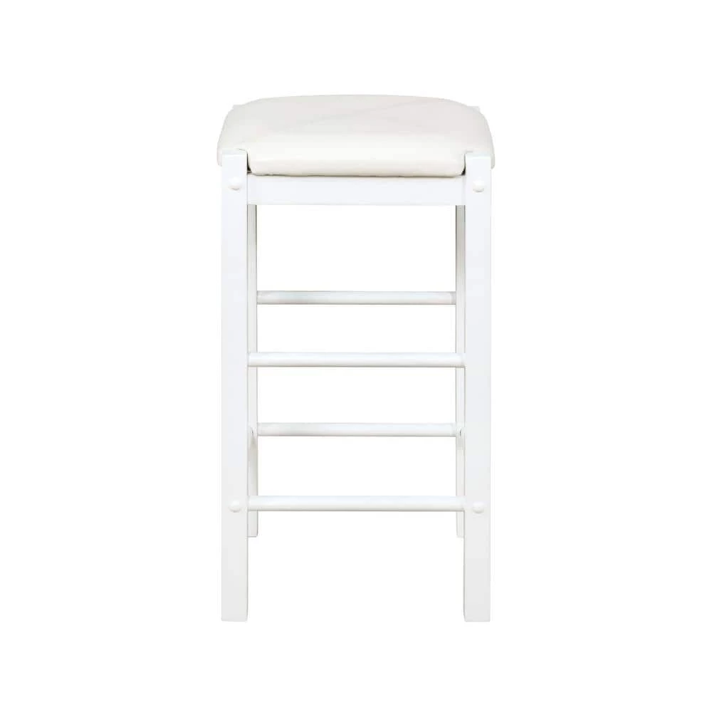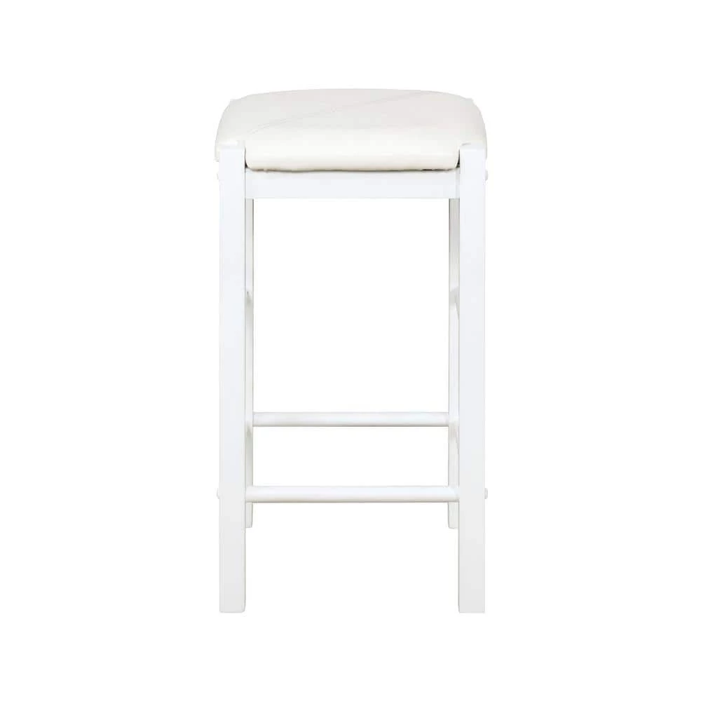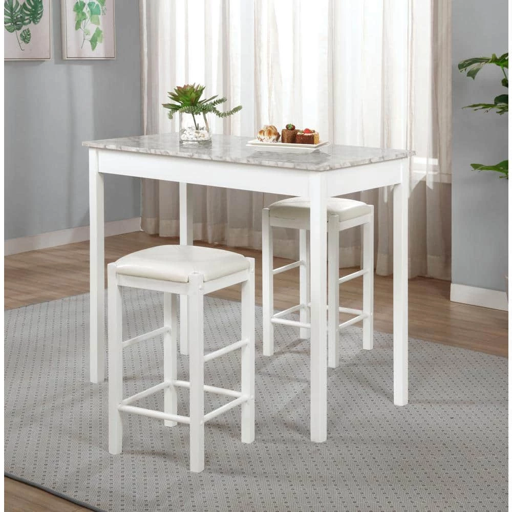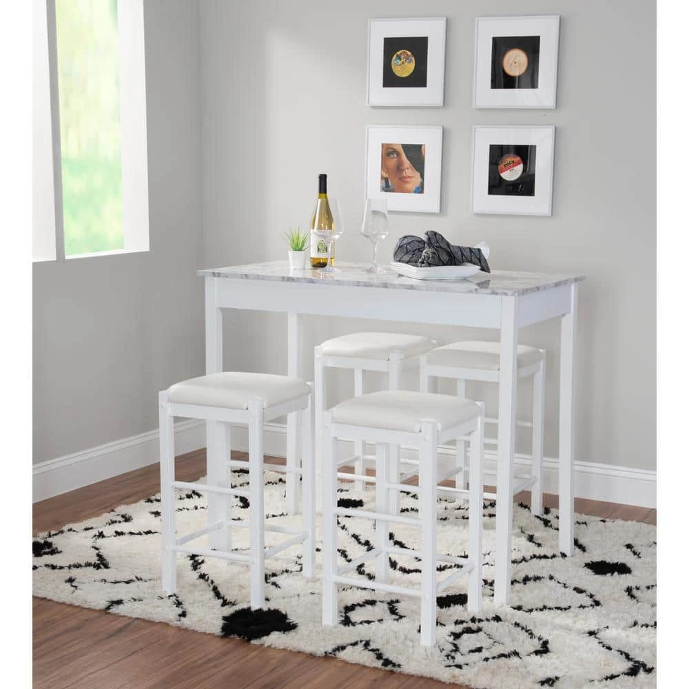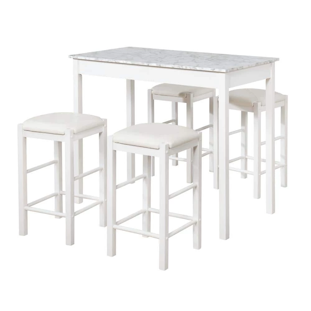 Mina White Faux Marble Tavern 5-Piece Counter Set with space saving convenience. This set features a elegant rectangular table on long sturdy legs with four backless counter height stools with padded, white faux leather upholstered seats. Made from solid woods and a faux marble top. The white finish of the base and legs gives this piece an elegant and sophisticated appeal. The stools tuck neatly under the table when not in use. Great for kitchen, dining area, den or any place your entertain.