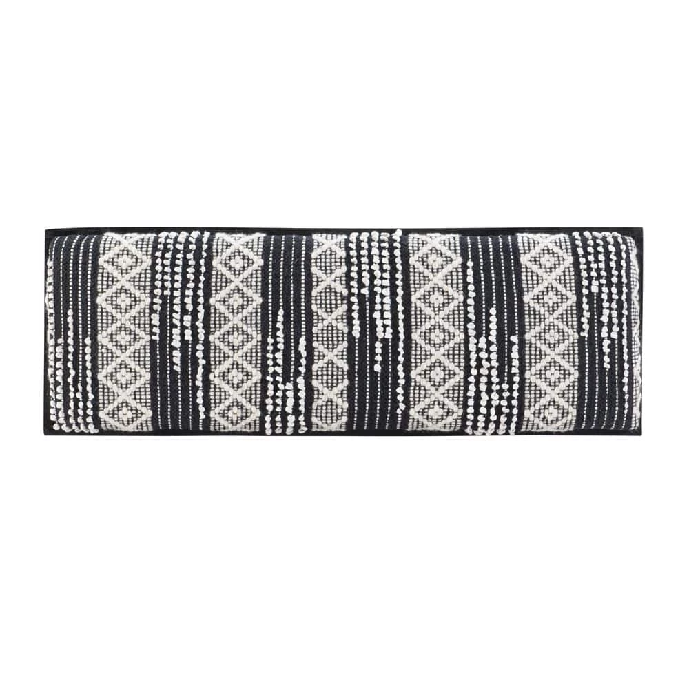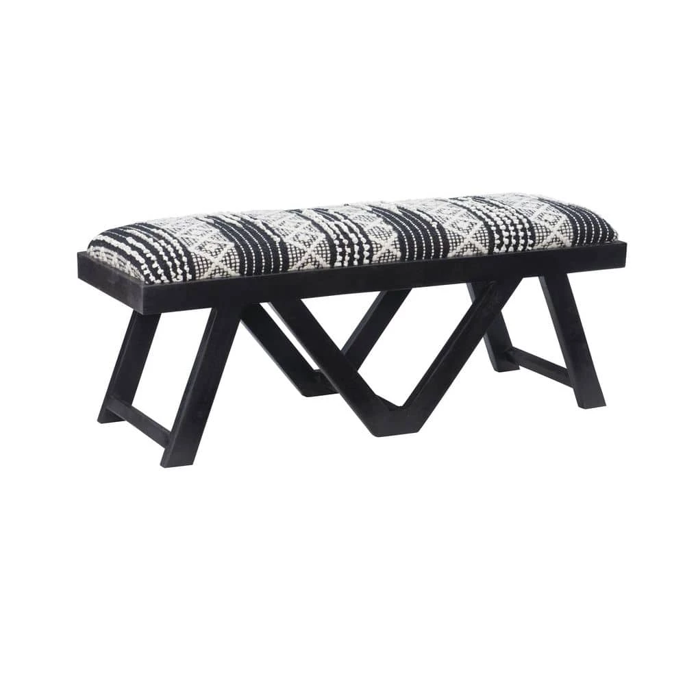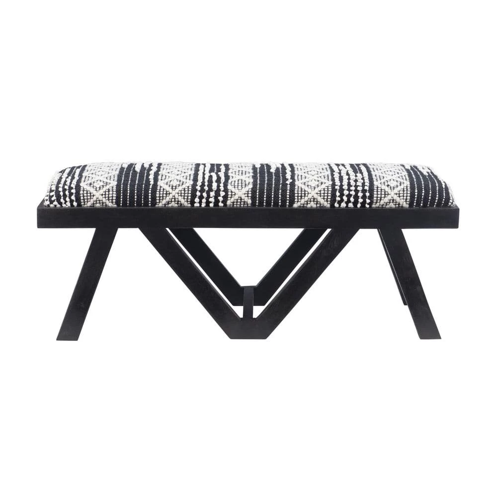 Enjoy the refined, yet light hearted aesthetic of this boho style Myah Black Upholstered Bench, brought forward by an eye catching seat and sleek, symmetrical base. The padded cushion is wrapped in cotton and acrylic upholstery, handwoven with a pit loom to create a texture similar to that of a rug. Geometric patterns in black and white pop against the solid mango wood frame and round out this versatile piece. Measuring at just 45 in. L x 16 in. D x 18 in. H, the compact design fits seamlessly with a variety of decor in your living room, bedroom, dining room or entryway.