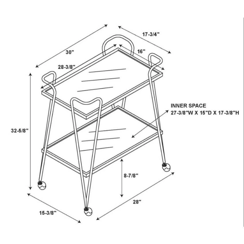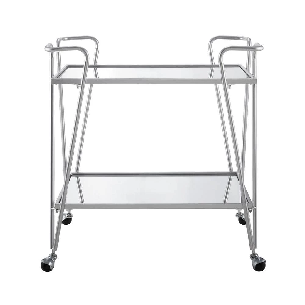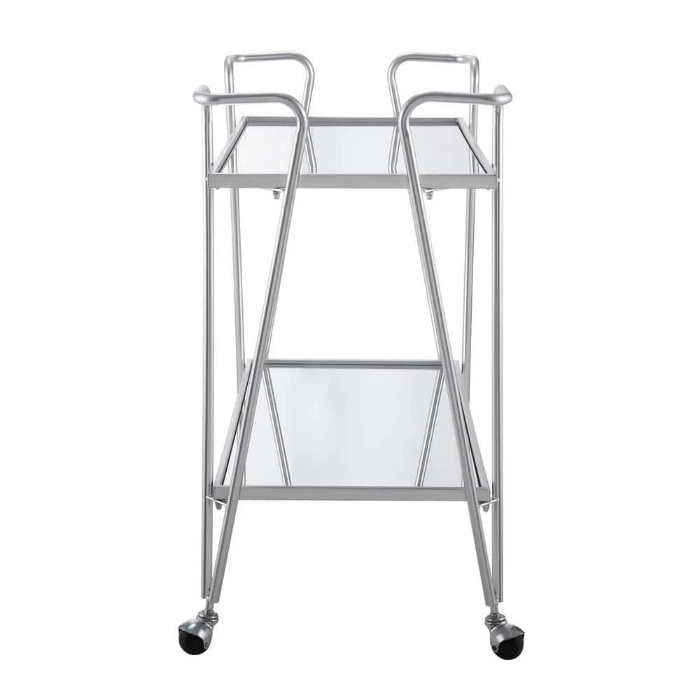 Ideal for entertaining, this Nancy Mid-Century Silver Wheeled Bar Cart is designed in classic mid-century modern style that will make any gathering feel special. Elegant tubular steel construction is finished with a silver powder coating that cradle two spacious shelves. Both shelves are the same size, feature a mirrored top and are surrounded by a slight lip so items will not roll off. Casters have a matching silver hood with black wheel and once the cart is rolled into place, locks keep it stationary. More than a bar cart, bring elegance to breakfast or coffee service in the morning or use as an accent piece that shows off collectables or art pieces.