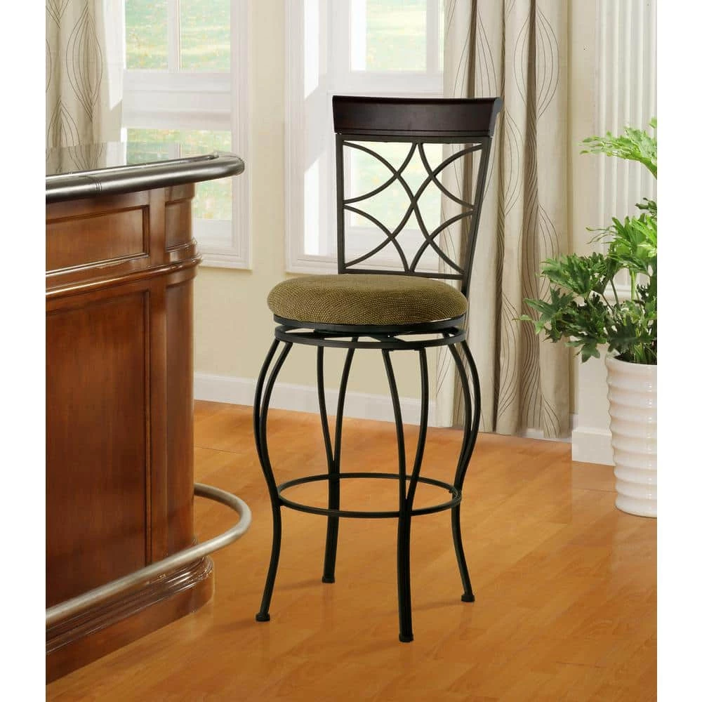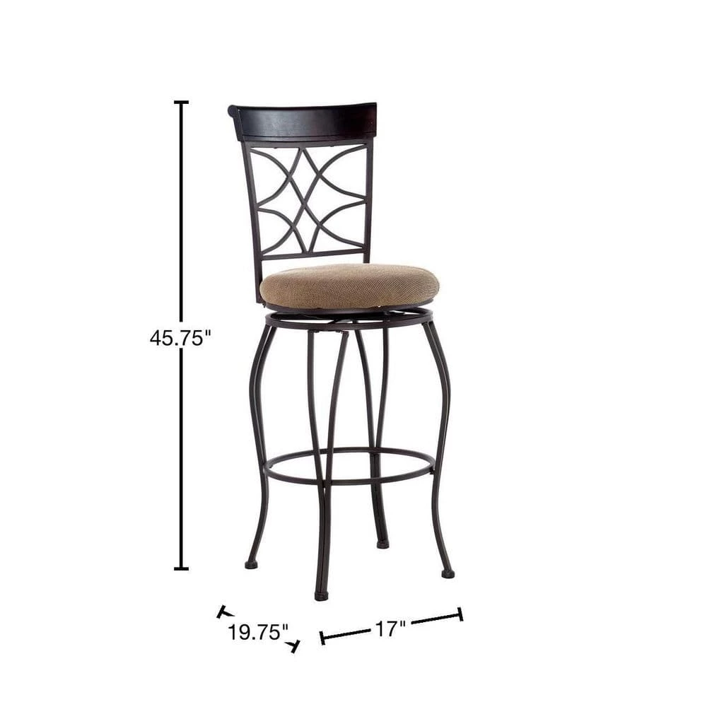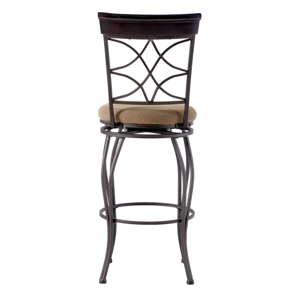 The elegance and unique style of this Newberry 30 in. Metallic Brown Back Metal Barstool will carry throughout your kitchen, dining, or home pub area. Crafted of metal and highlighted with subtle curves and a distinctive back, this stool is a positively striking addition to your home. The cushion is piled high for extra comfort making this stool versatile for any gathering area. Finished in metallic brown with a brown wood accent. The seat is covered in a beige and black microfiber. 275 lbs. weight limit.