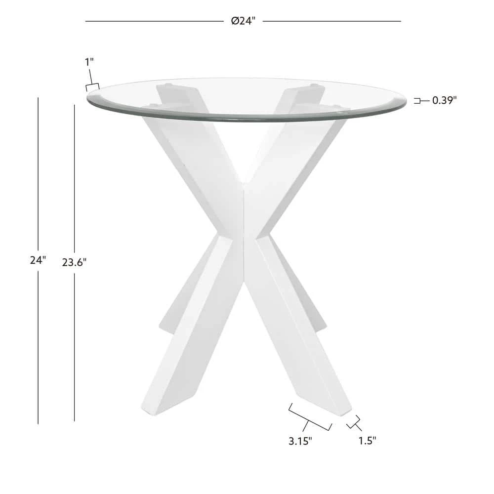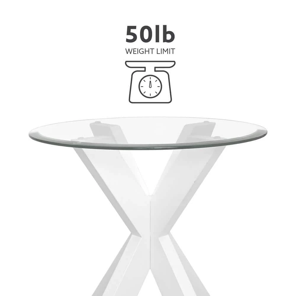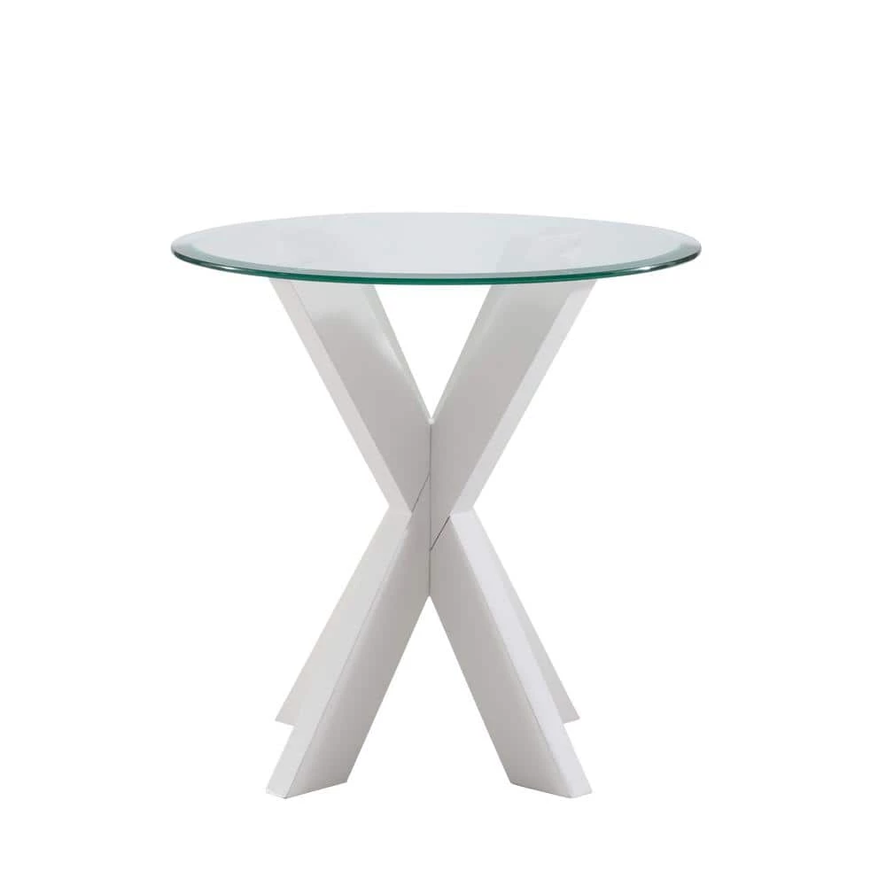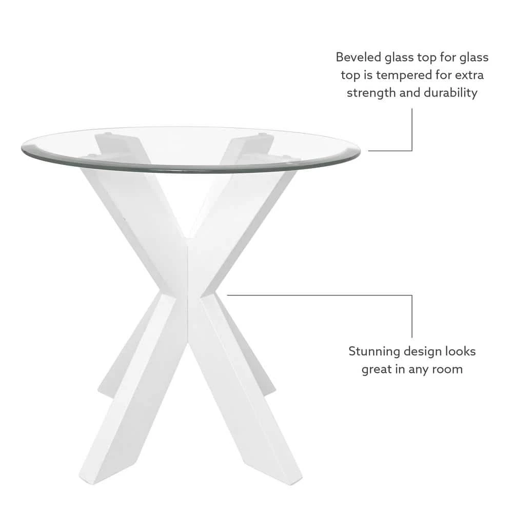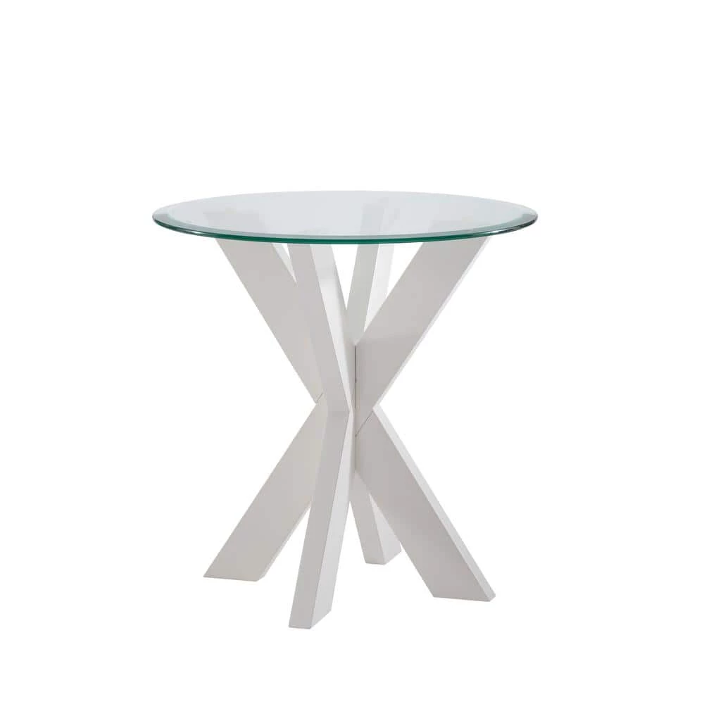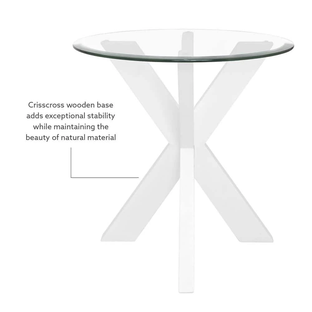 Update your space with this stunning modern Norris White Xbase Side Table with Glass. A beveled transparent glass top is paired with a crisscross wood base for a midcentury feel with an industrial edge. The beautifully crafted acacia legs are stained with a white finish that blends easily with styles from rustic farmhouse to contemporary. The compact round design works well in both large and small spaces. Nestled between living room chairs or in a bedroom corner, this piece will be a versatile addition to your furniture ensemble.