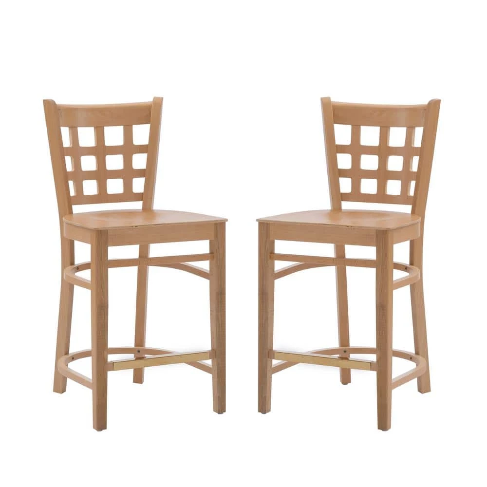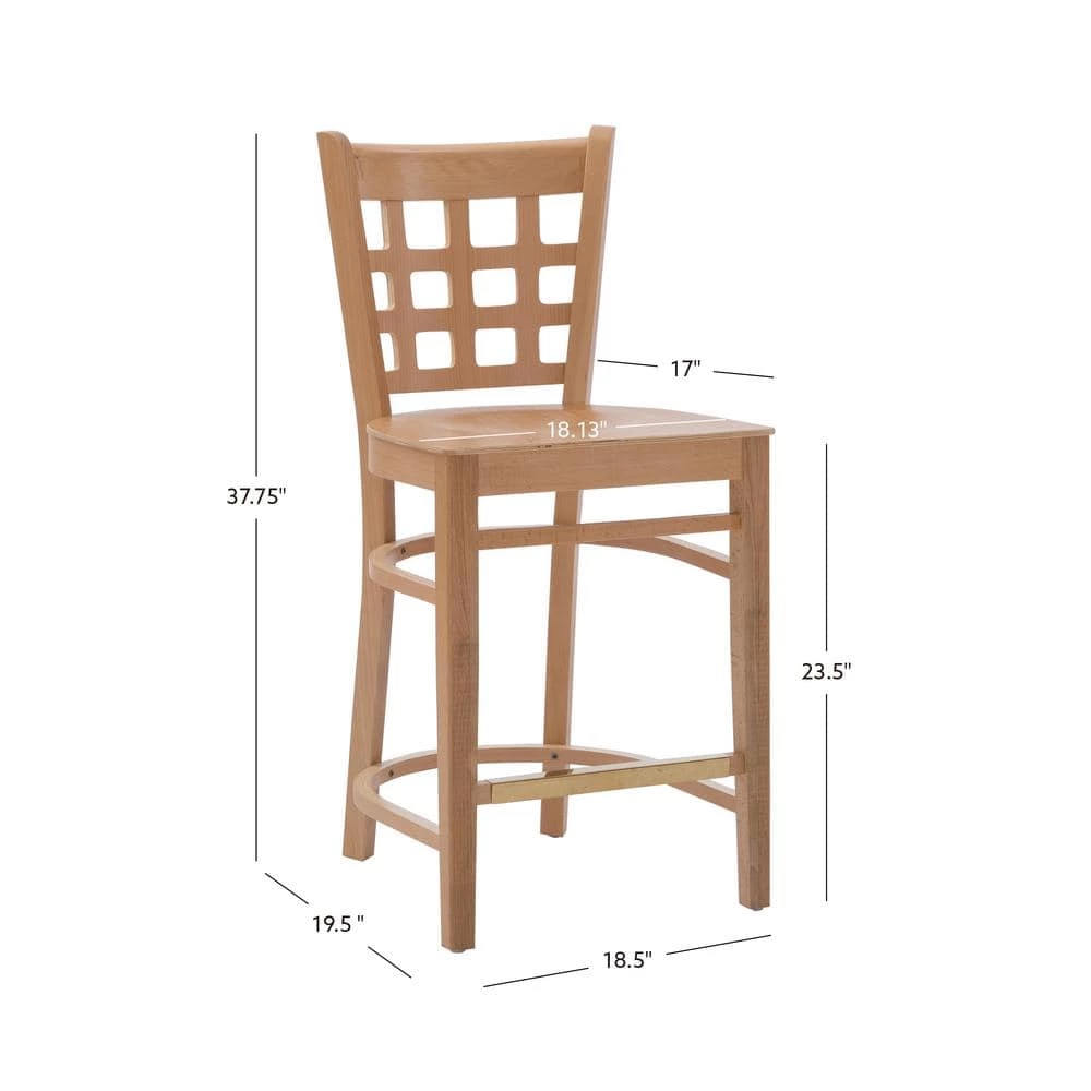 Holding to tradition, yet striking balance with modern temperament, this farmhouse style Olympia Natural Counter stool w/ wood seat (Set of 2) is a perfect addition to a variety of dining settings. A grid of open squares is framed by the curved back, inspired by lattice fencing of distant countryside’s. Made of solid beechwood for ensured strength and stability, the frame is given a natural finish, then sealed and sanded before receiving a glossy lacquer coating. With a seat height of 23.5 in., the set of two is an ideal match for counters 35 in. to 39 in. high and supports up to 300 lbs. each chair.