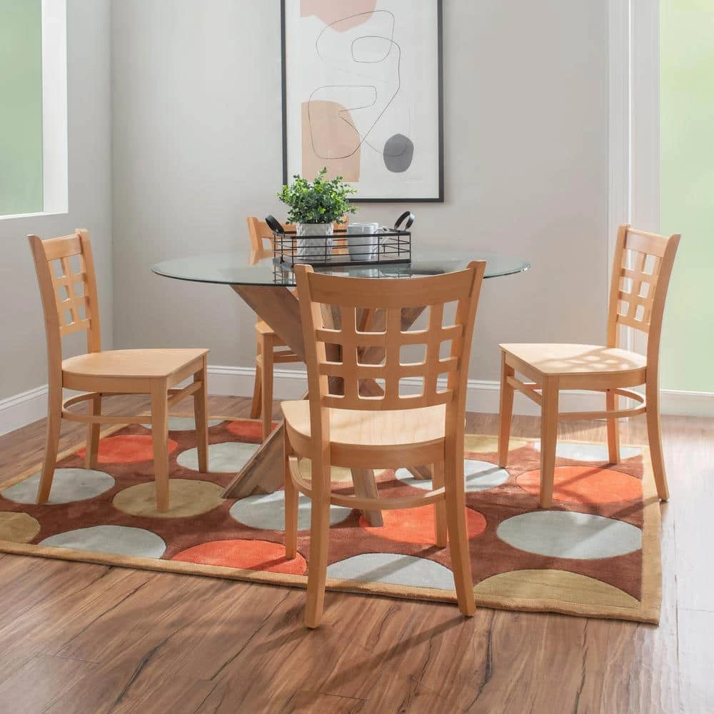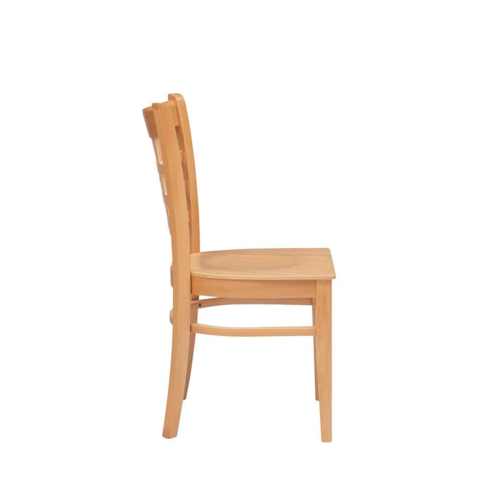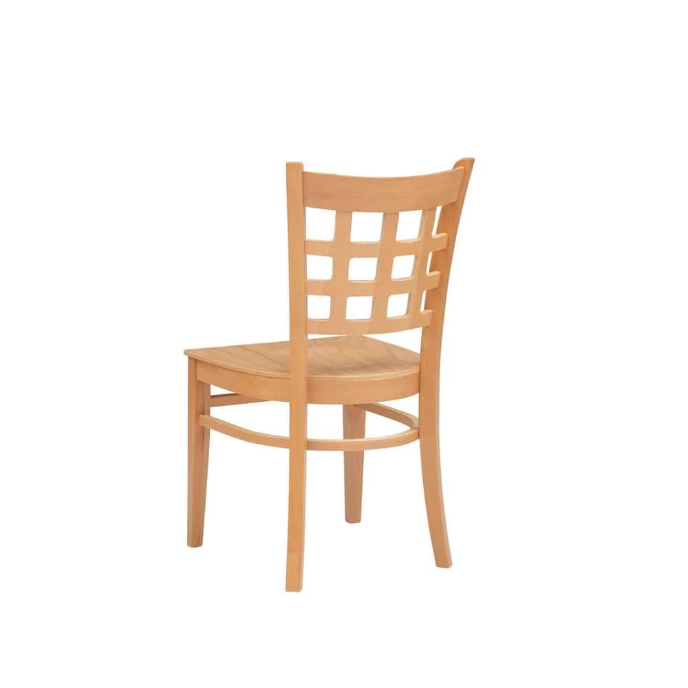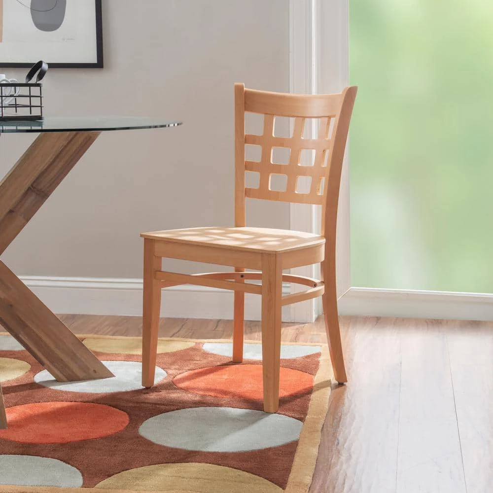 Traditional yet informed by modern sentiment, this farmhouse Olympia Natural Dining chair solid wood seat (2 pack) is a versatile addition to a wide range of settings. A grid of open squares is framed by the curved back, inspired by lattice fencing of a distant countryside. The sturdy beechwood frame coated with a natural lacquer allows the beauty of the wood grain to shine through. This set of two arrives fully assembled and supports up to 300 lbs. for each seat.