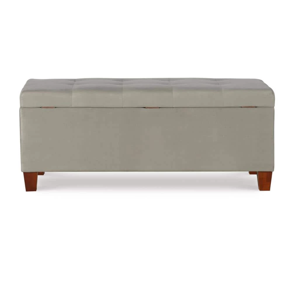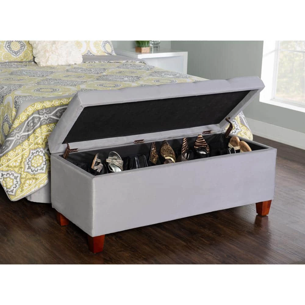 The Phoebe Grey Shoe Storage Ottoman with Button Tufted Top is perfect for placing in a large closet, entry or at the foot of a bed. The grey microfiber upholstery allows this piece to easily complement any decor style and color scheme. The top tufting details adds an eye-catching accent to the piece. Once opened, ample interior storage space is revealed. Side pockets are perfect for storing a multitude of shoes, while the open center provides space for other items. A plush cushioned top makes this piece perfect for sitting.