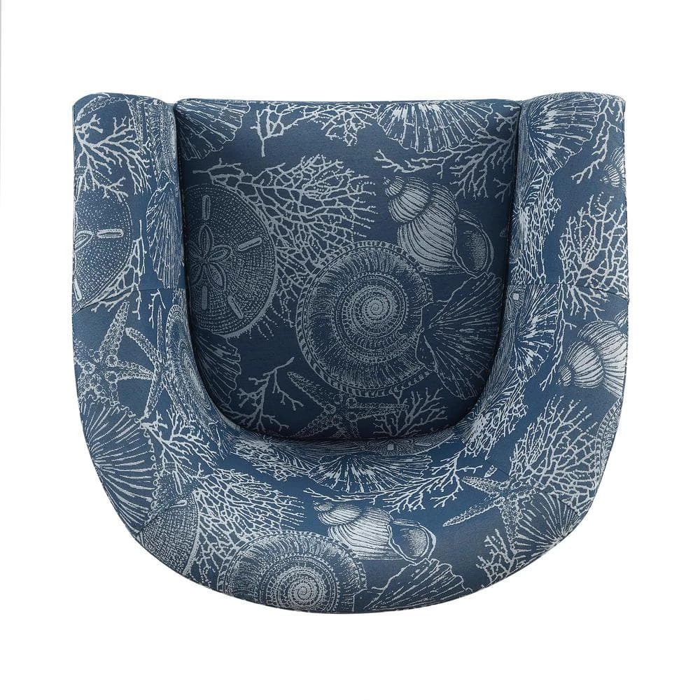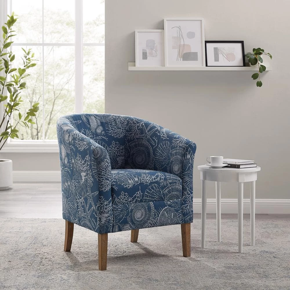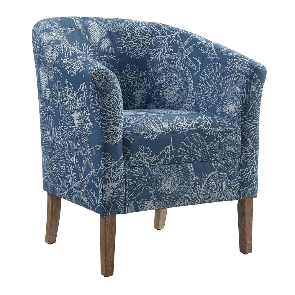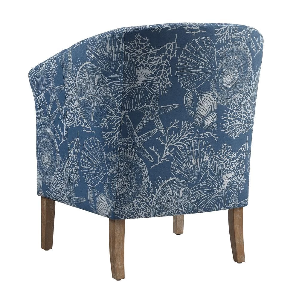 Invite the spirit and mystery of the sea into your home with this captivating Primm Denim Club Chair. Swirling shells and creatures of the deep are celebrated in the woven jacquard fabric stretched over padded foam. The wide barrel shape is accentuated by flared arms and a deep seat with a 5.9 in. thick non removable cushion. A hardwood frame and springs provide comfort, strength and durability you can count on, while the natural finish of the legs resembles driftwood, further adding to the coastal aesthetic. Upon arrival, the only assembly required is the attachment of the legs. You’ll be out to sea in no time.