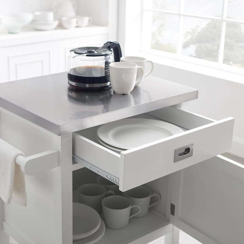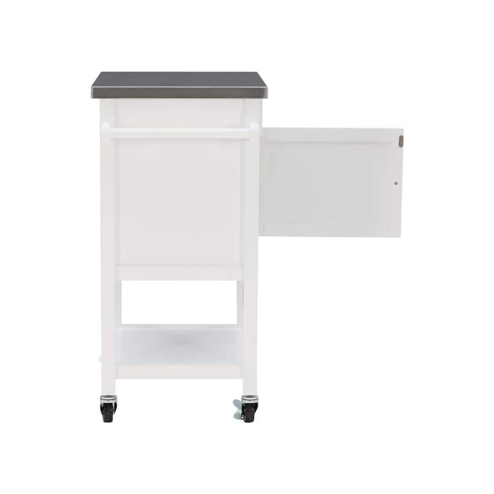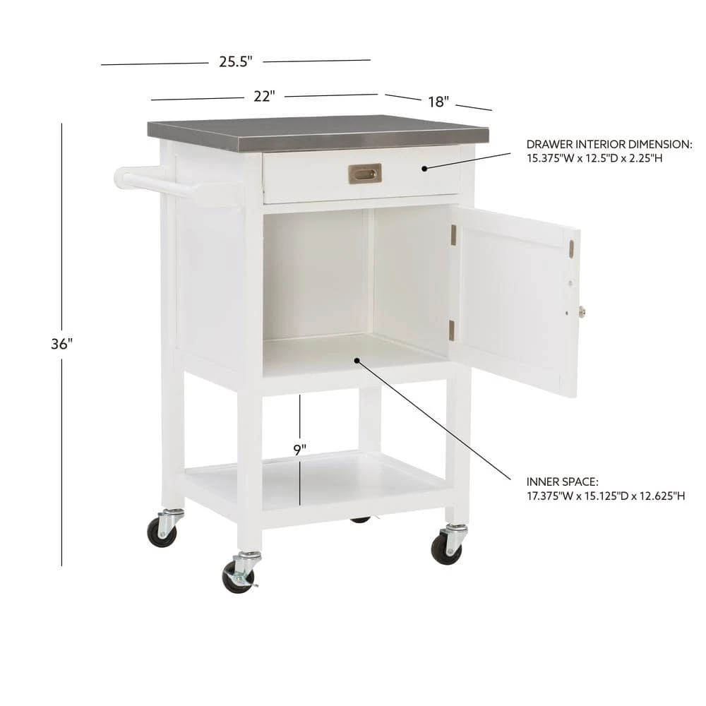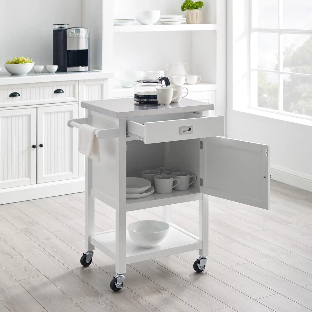 Add valuable storage to any setting with this Renee White Apartment Cart with Locking Wheels. Perfect for entertaining, it also enhances a kitchen, office, bathroom or living area. The top drawer and enclosed cabinet provide hidden storage, while the food safe, easy to clean stainless steel workspace holds a coffee maker or compact microwave. You can display linens on the towel bar and dinnerware on the bottom shelf. Clean lines, a white finish and stainless accents complement any decor. Smooth rolling, locking casters make moving and securing the cart simple.