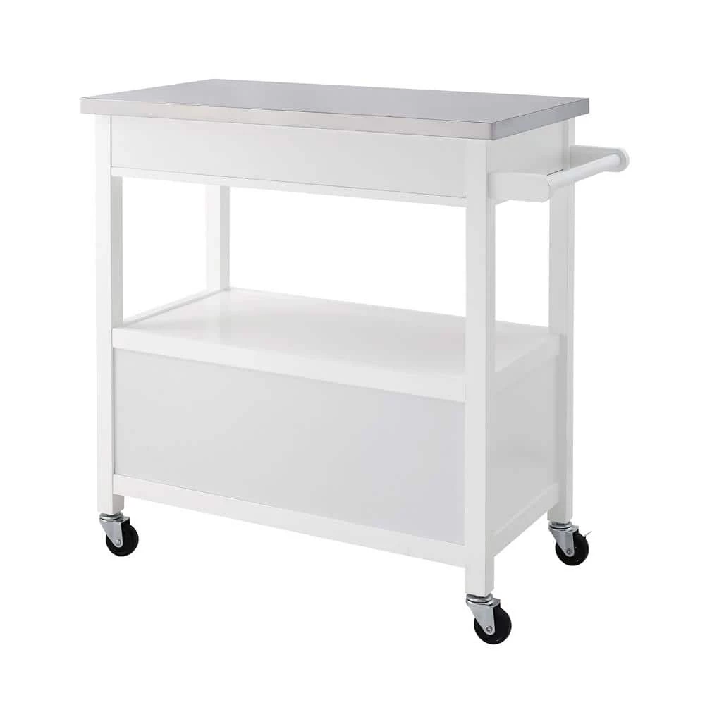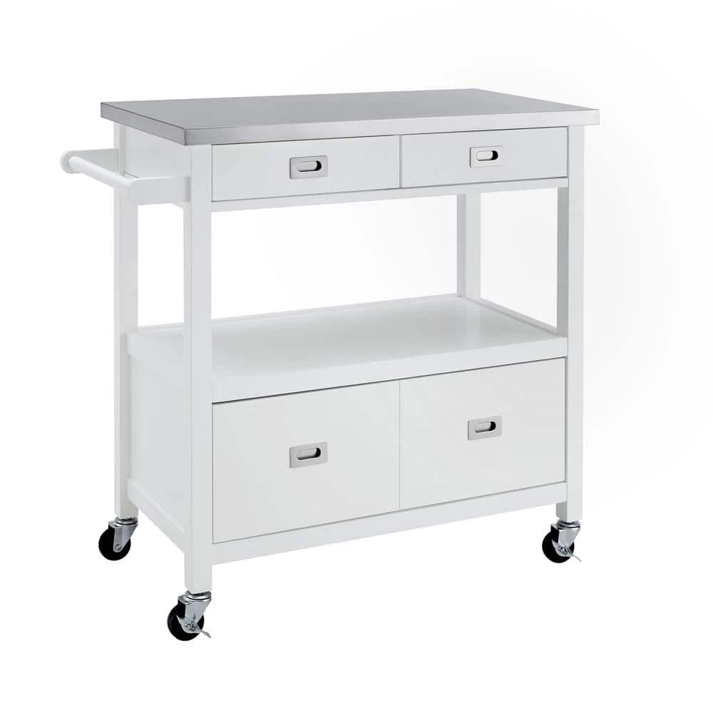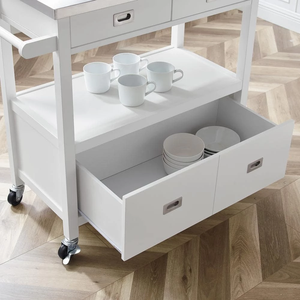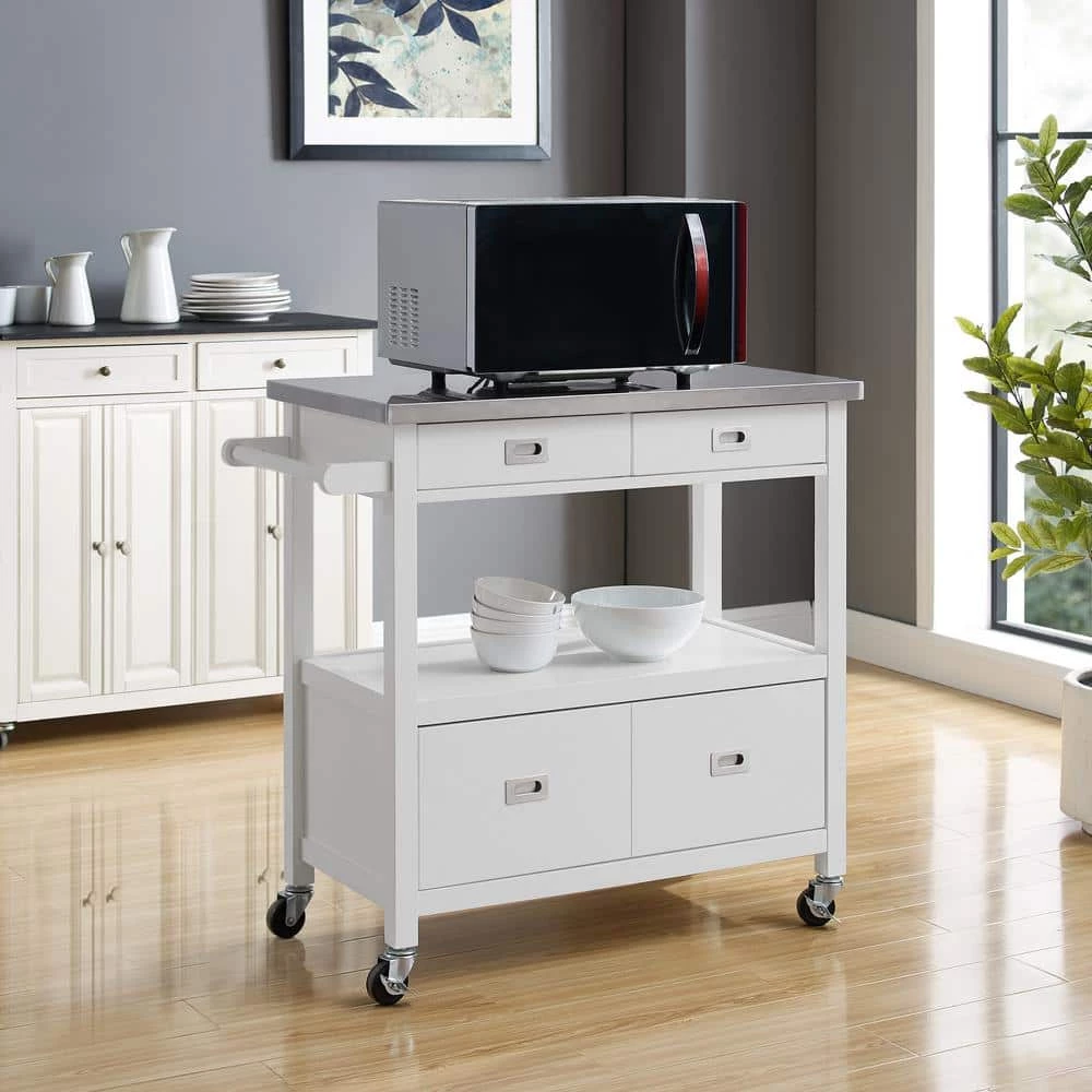 Classic, convenient and easy to stow away, the spacious Renee White Kitchen Cart with Locking Wheels perfectly outfits your kitchen or food prep area. Cast in a soothing gloss white finish, 1-large and two small drawers open smoothly to revel ample storage for everything from utensils to pots and serving ware. The food-safe stainless steel top is easy to clean after meal prepping, so your guests can enjoy this chic kitchen island as they drink wine or indulge in hors d’oeuvres. A large middle open shelf area is great for displaying wine glasses, cook books or collectables. Large wheel casters make moving the island a breeze and they lock for stability. Can accommodate full size microwave ovens and coffee makers.