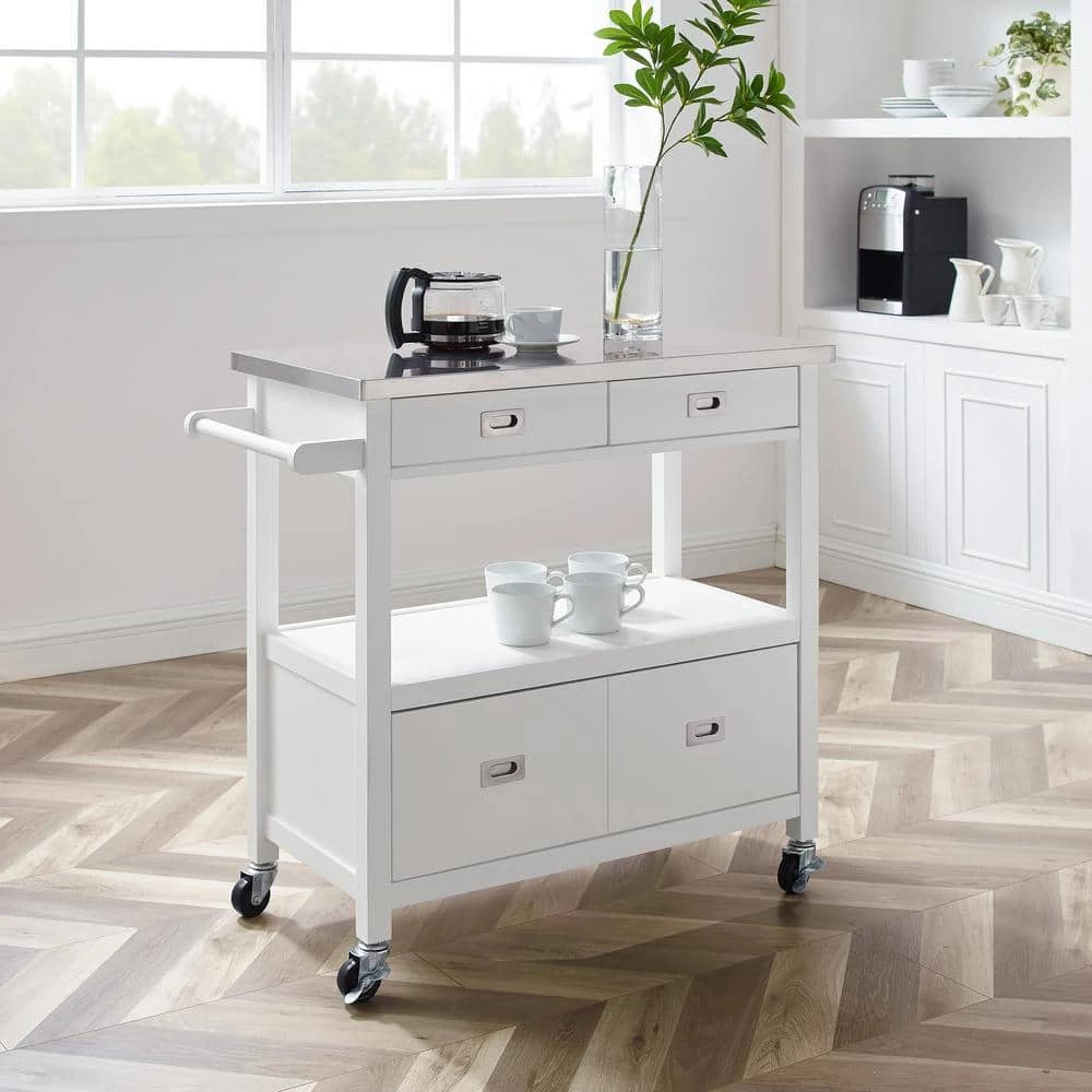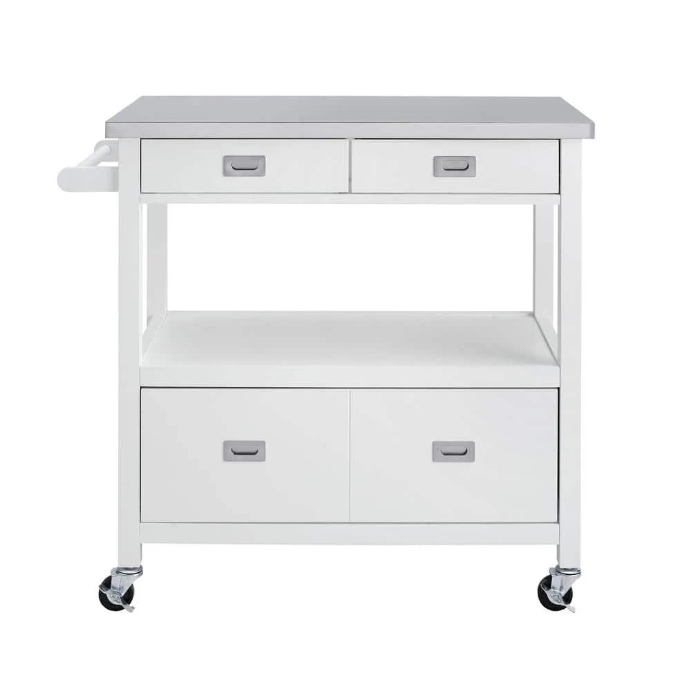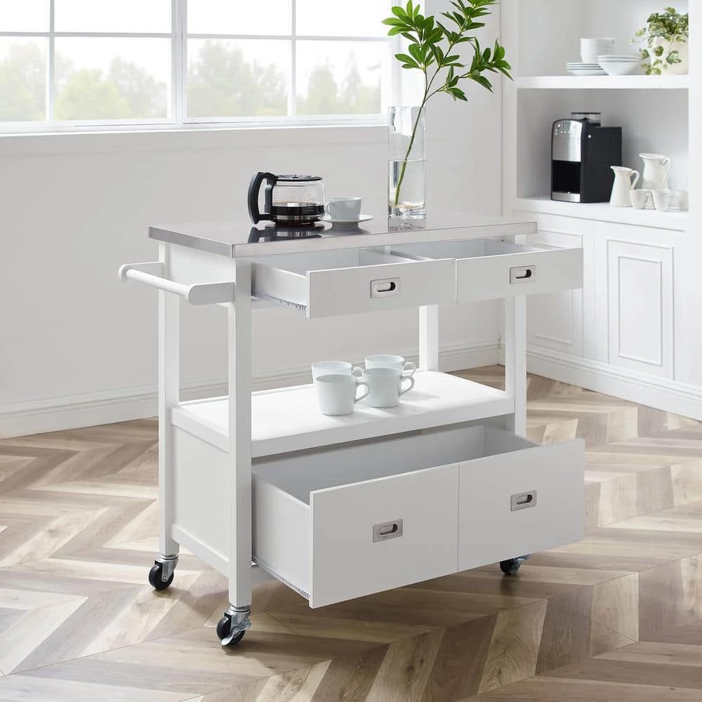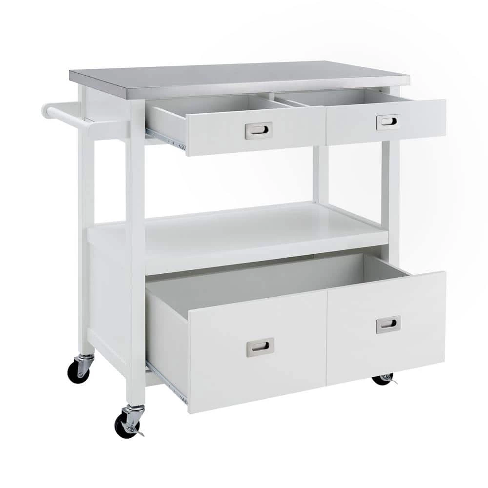 Classic, convenient and easy to stow away, the spacious Renee White Kitchen Cart with Locking Wheels perfectly outfits your kitchen or food prep area. Cast in a soothing gloss white finish, 1-large and two small drawers open smoothly to revel ample storage for everything from utensils to pots and serving ware. The food-safe stainless steel top is easy to clean after meal prepping, so your guests can enjoy this chic kitchen island as they drink wine or indulge in hors d’oeuvres. A large middle open shelf area is great for displaying wine glasses, cook books or collectables. Large wheel casters make moving the island a breeze and they lock for stability. Can accommodate full size microwave ovens and coffee makers.