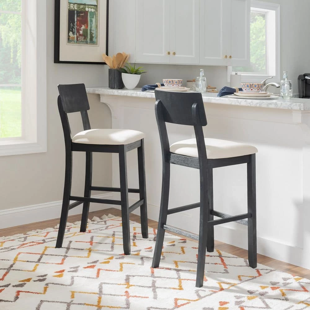 Made for modern times but holding onto hints of yesteryear’s charm, this Rodman Dark Charcoal Barstool will fit right in with your home decor. The sturdy acacia wood frame is painted in a dark charcoal black that offers a rustic wire brushed texture with traces of the wood grain peeking through. A generously padded cushion is upholstered in beige linen and cotton fabric to create an inviting perch that’s a breeze to maintain. With a seat height of 31.5″, this stool is an excellent match for bars 41″ to 43″ high.