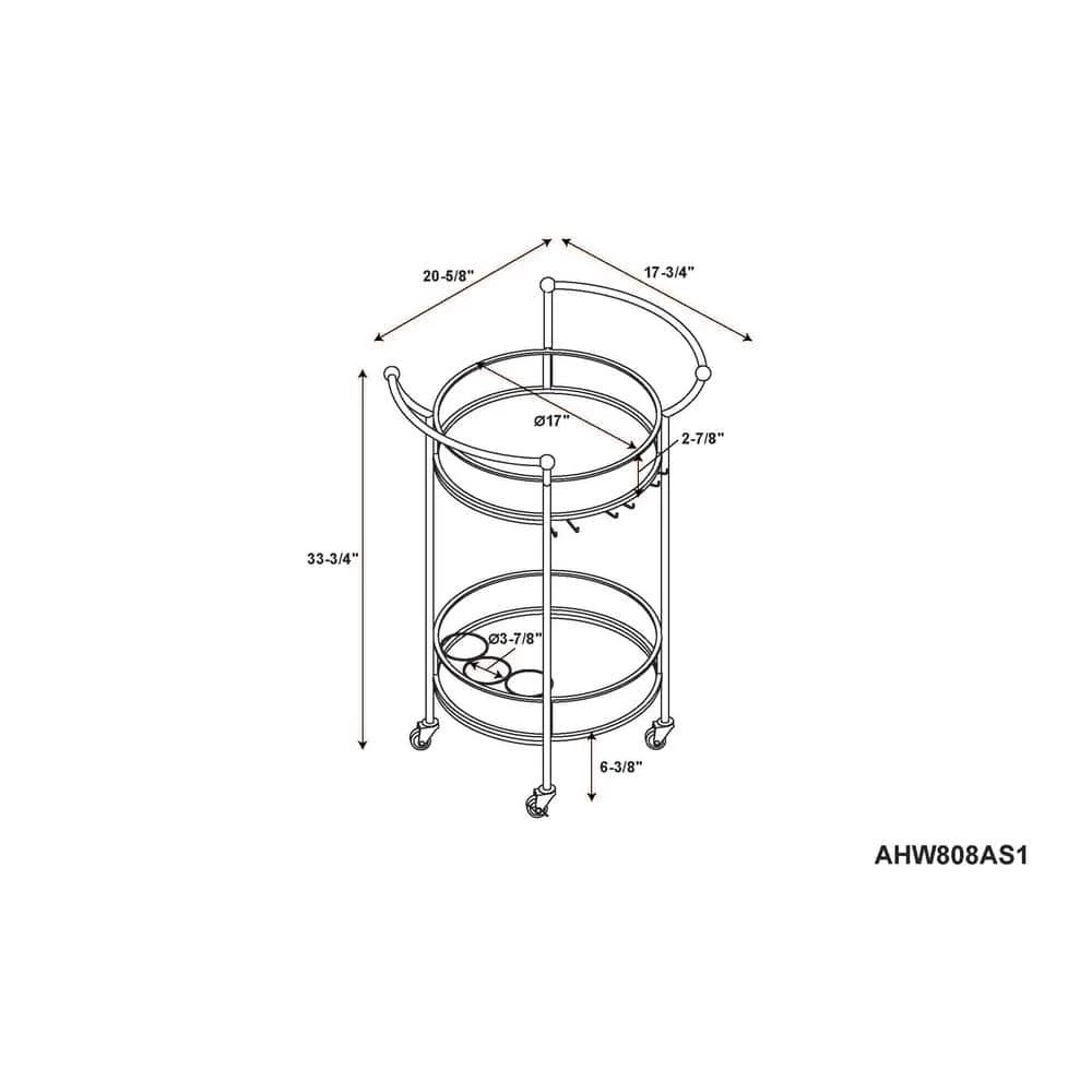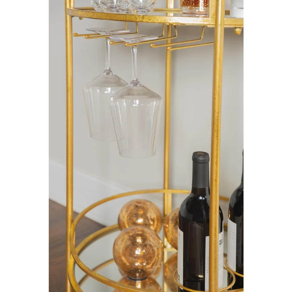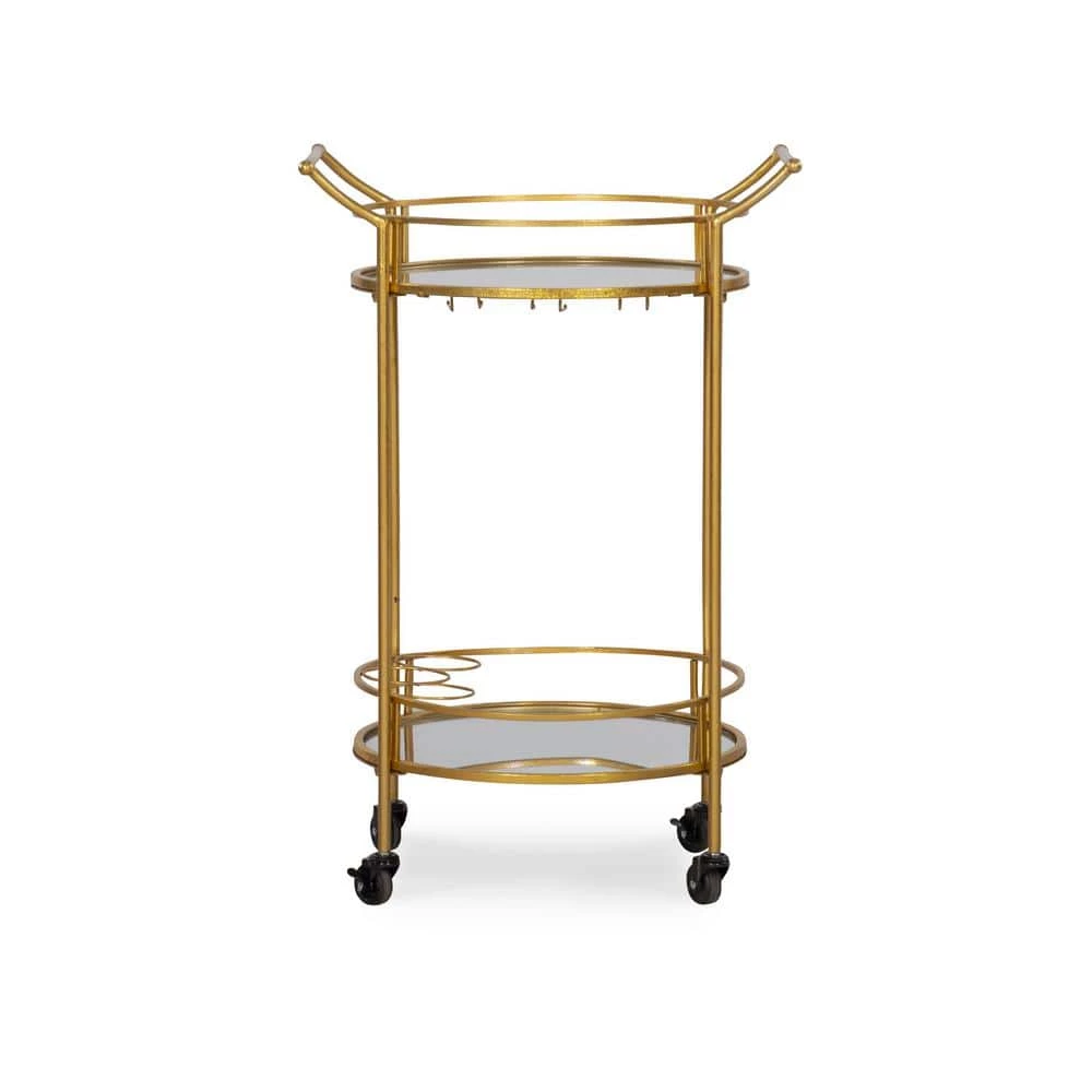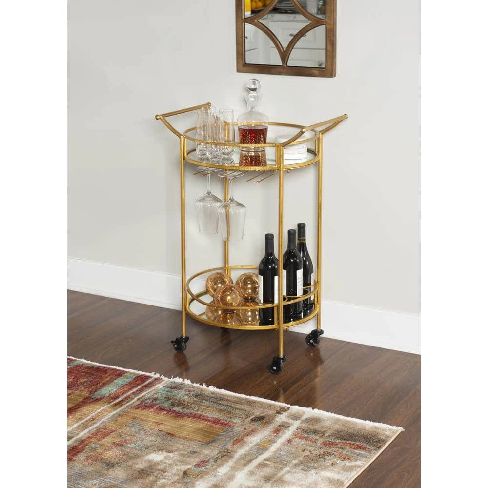 Impress your friends with this elegant, vintage chic round gold metal bar cart with handles and mirrored tops. The cart features 2 handles, functioning wheels, a top mirrored shelf with wine glass holders, and a bottom mirrored shelf with 3 wine bottle holders. The cart base is made of Iron with Gold and Gold Leaf finish. This bar cart is the perfect addition for any dining, bar, or lounge area in your home.