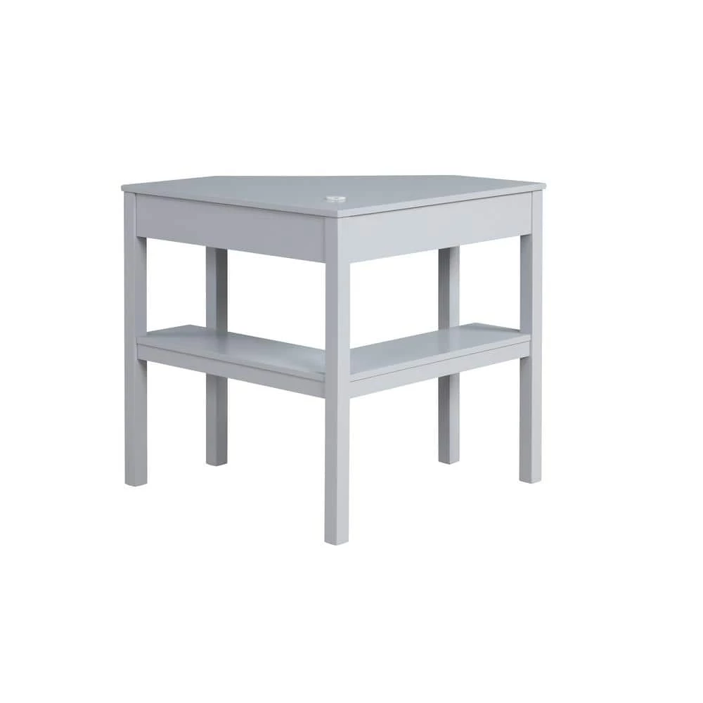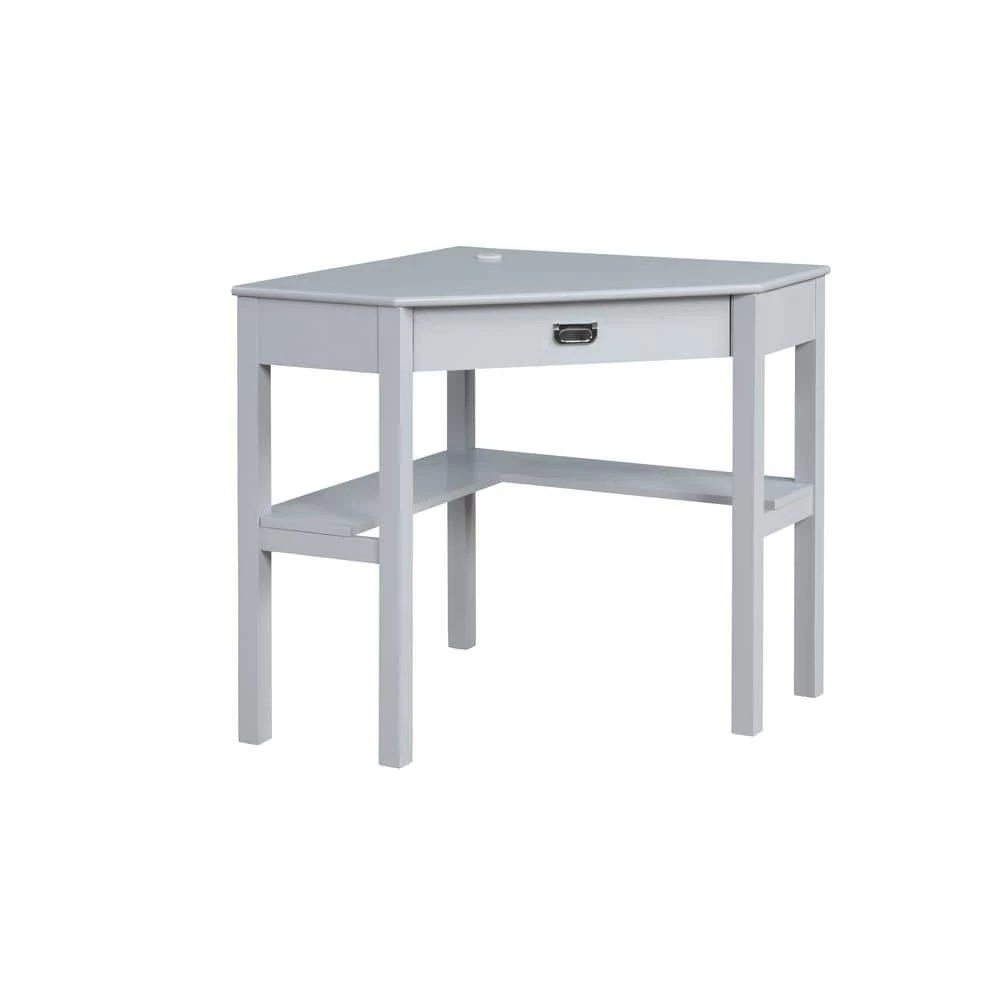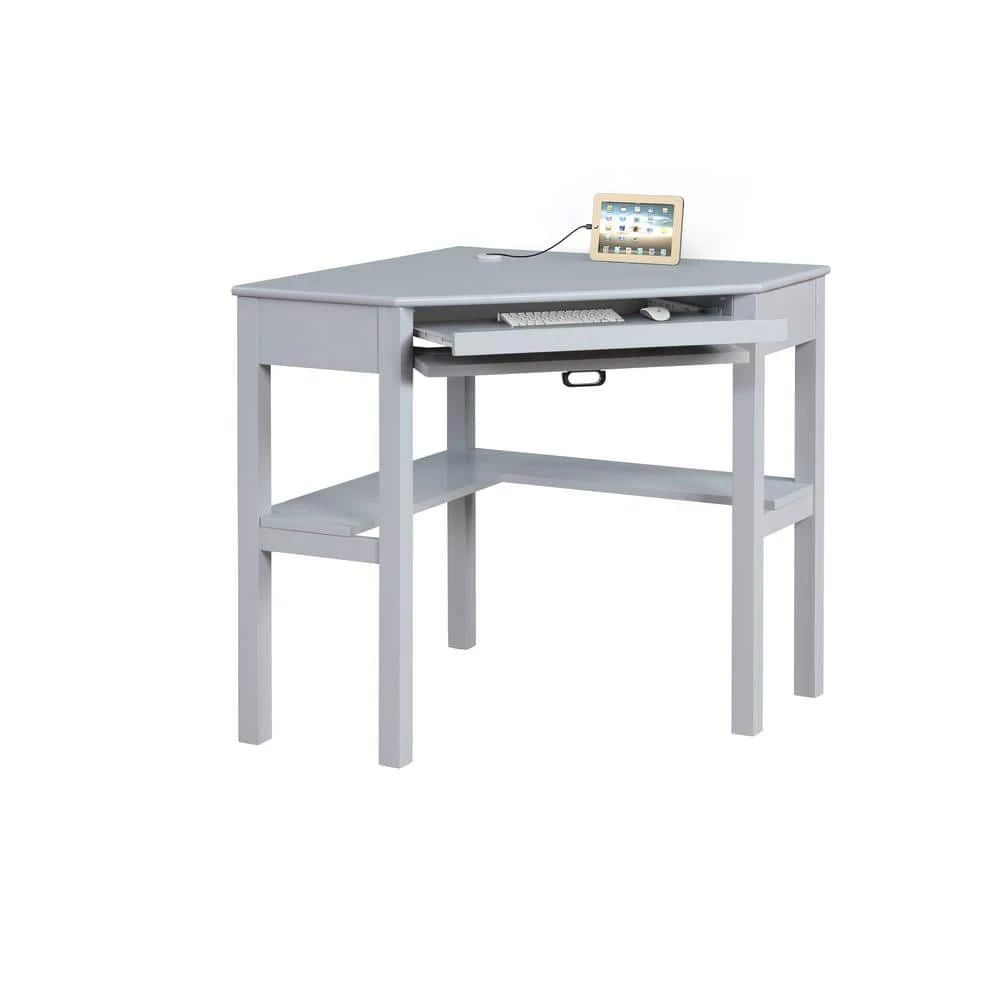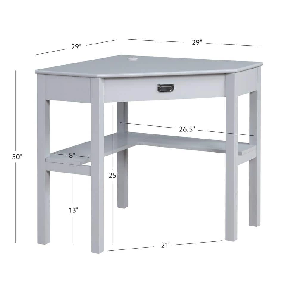Make the most of your space with this fashionable Sara 29 in. W Corner Desk Grey with Keyboard and Mouse Tray. A modern take on a beloved classic, this unique corner desk is finished in grey and accented by a polished silver drawer pull. Clever features include a hidden pullout keyboard tray and shelves to help keep you organized. Plus, the desktop grommet will keep your wayward electronic wires tidy. With a space saving design and clean lines, this desk is the perfect addition to your home office, dorm room or craft area.