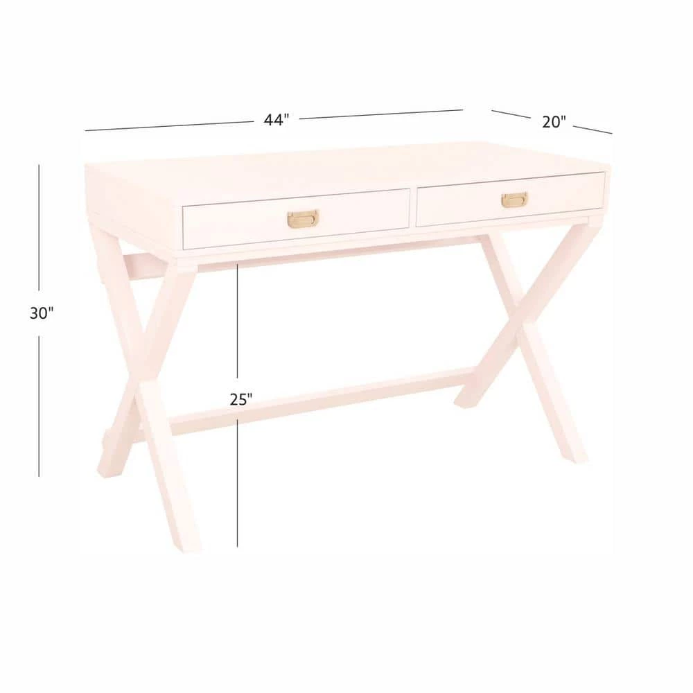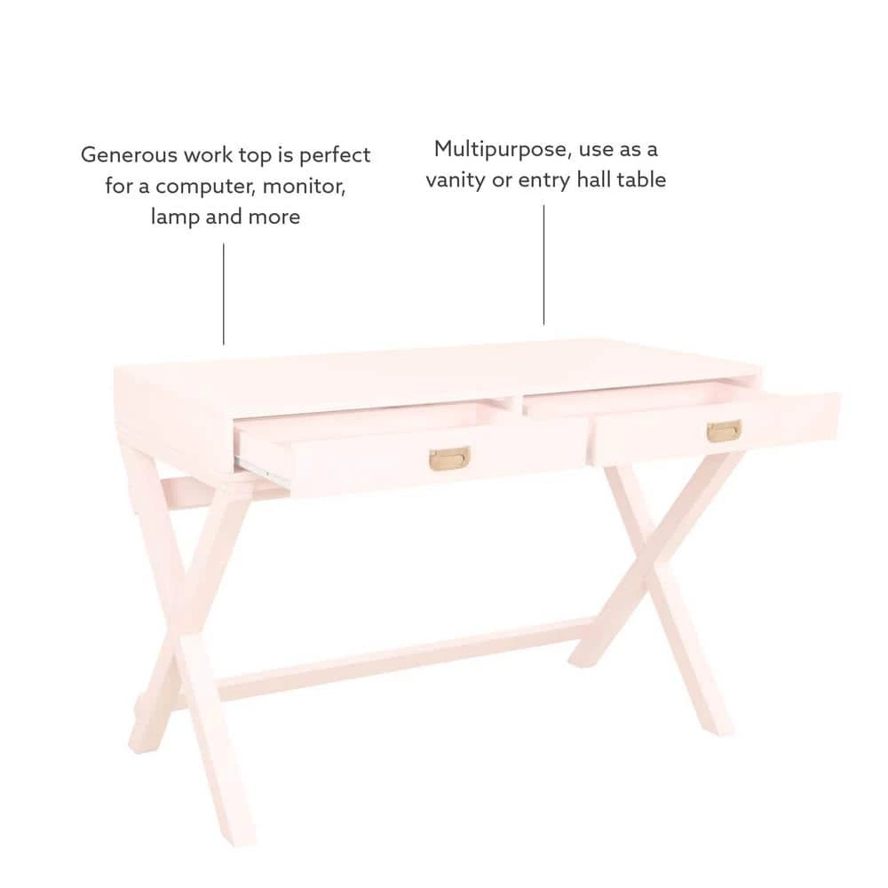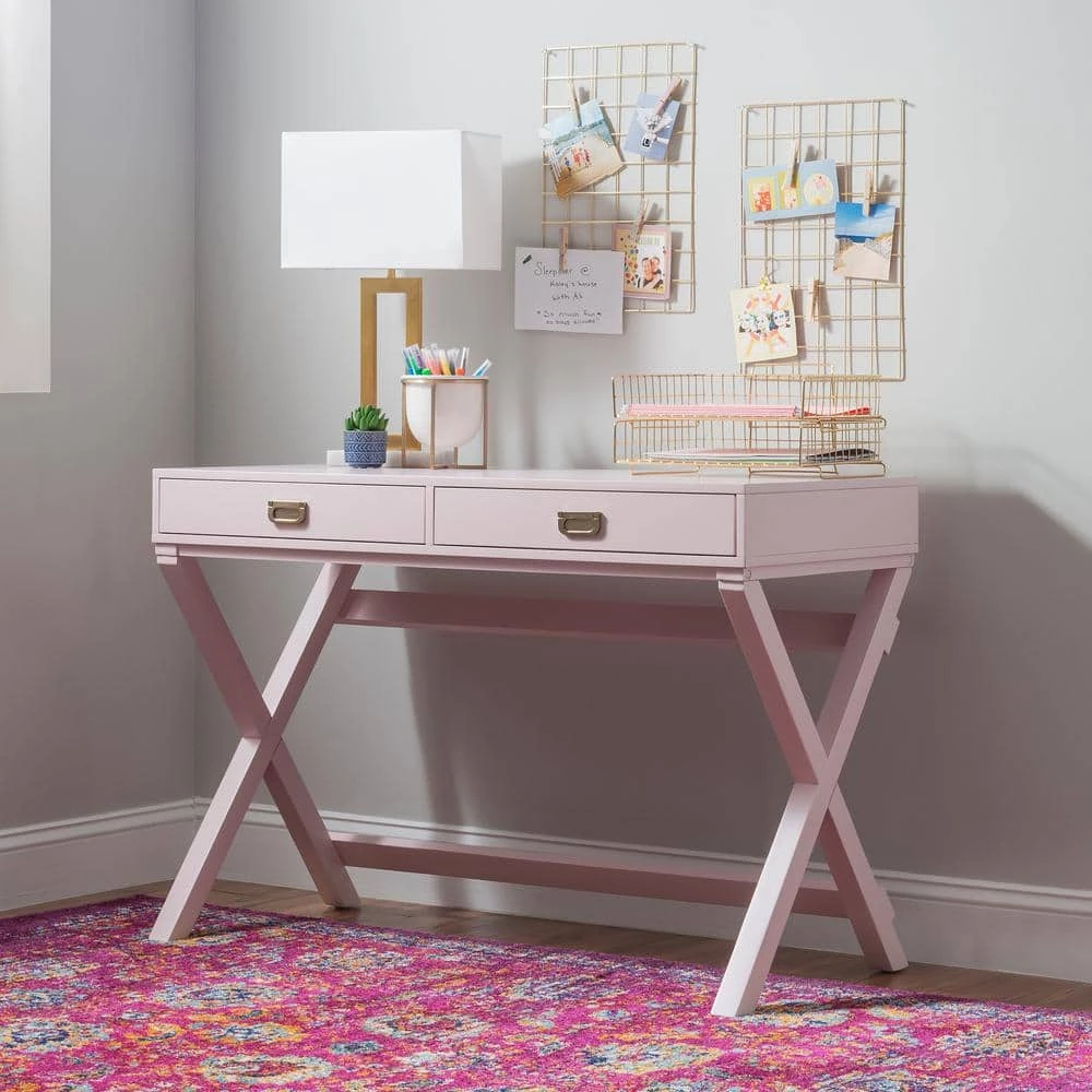 Upgrade your workspace with this sleek, Sara Light Pink Writing Desk. Finished in light pink with shiny rose gold hardware, this multifunctional piece adds a pop of color and organization to any office or work area. It features 2-drawers with metal glides, providing great storage for supplies. The X-frame, wooden legs create a sturdy foundation with a distinctly modern look. At 44 in. wide, its smooth top offers generous space for your computer, a lamp and more.