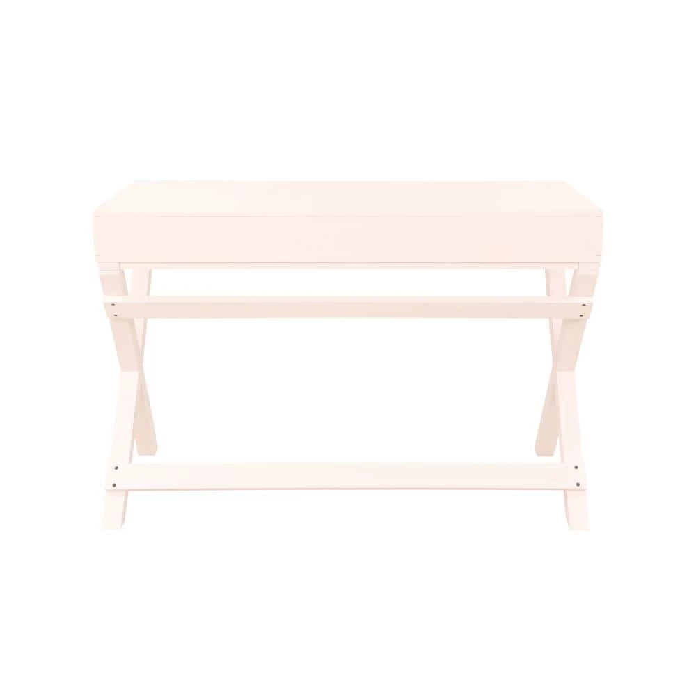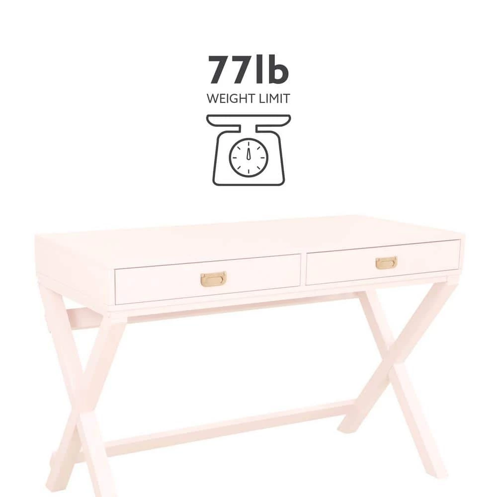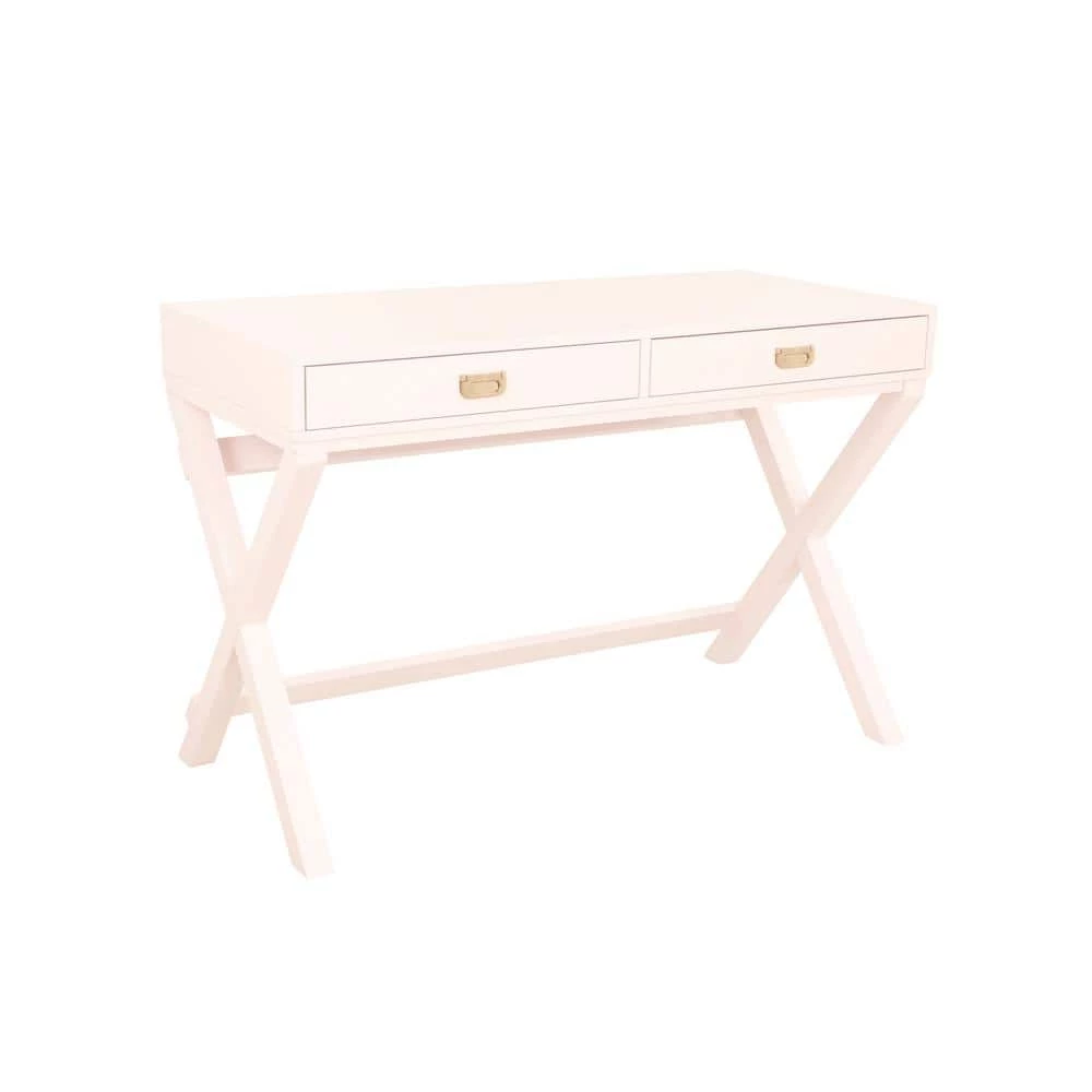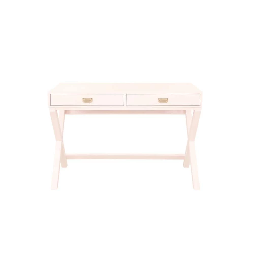 Upgrade your workspace with this sleek, Sara Light Pink Writing Desk. Finished in light pink with shiny rose gold hardware, this multifunctional piece adds a pop of color and organization to any office or work area. It features 2-drawers with metal glides, providing great storage for supplies. The X-frame, wooden legs create a sturdy foundation with a distinctly modern look. At 44 in. wide, its smooth top offers generous space for your computer, a lamp and more.