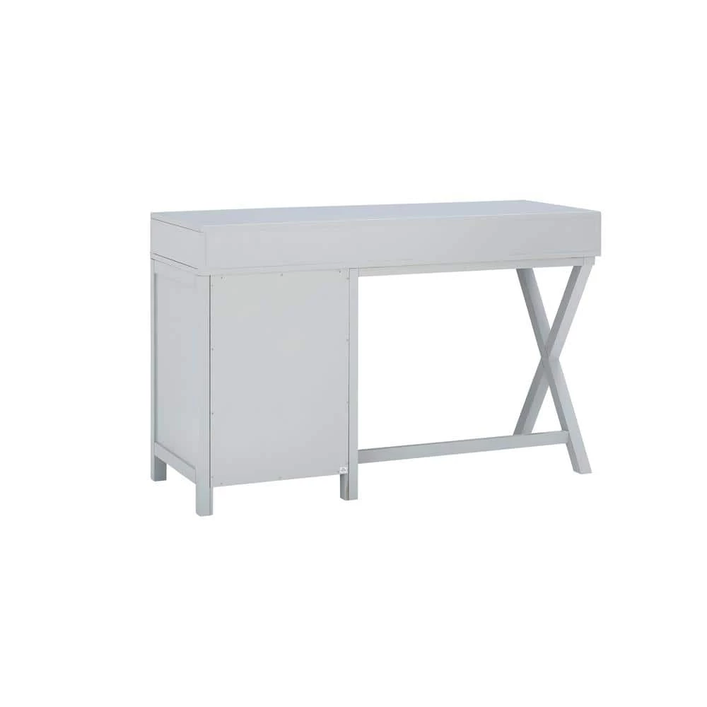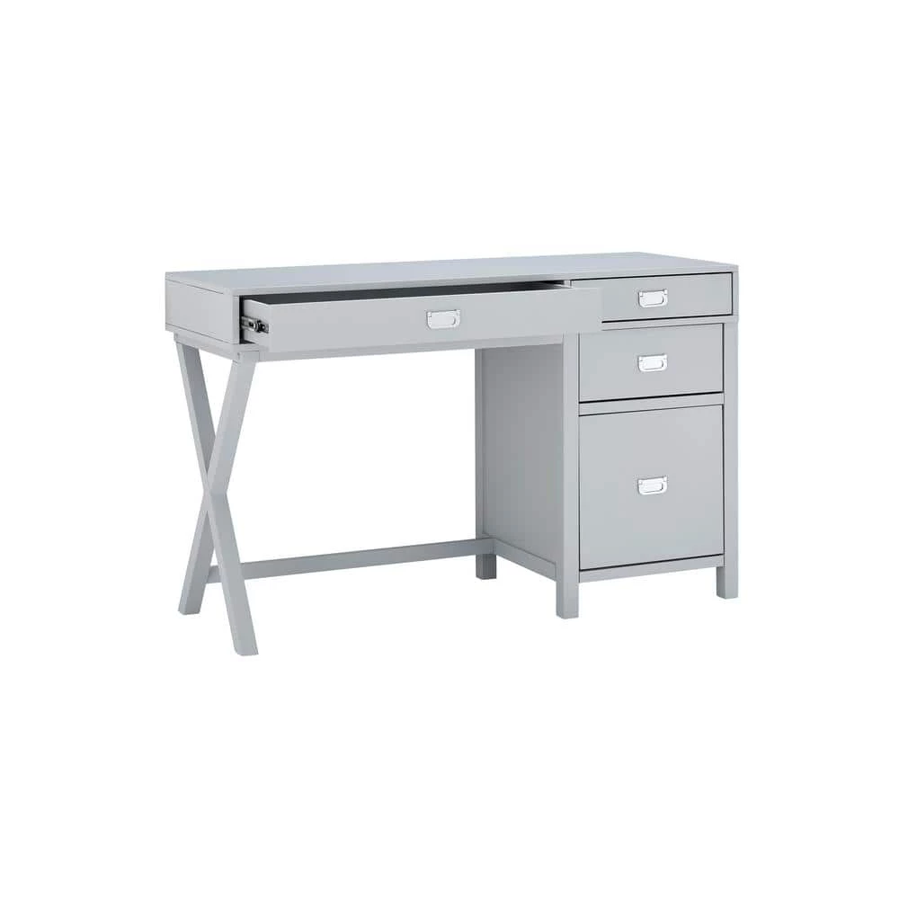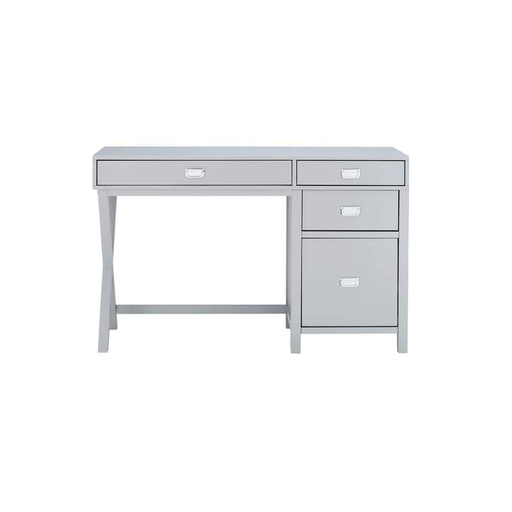 Gain new levels of control over your productivity and organization with this sleek Sara Grey Desk with Side Storage. The 48 in. x 18 in. Design provides an ample workspace without overcrowding your home office or bedroom. 3-drawers and a larger file storage drawer seamlessly tucked under the desk and equipped with shiny silver metal handles. The modern grey finish pairs well with today’s cutting edge decor, but is subtle enough to blend with almost any other setting.
