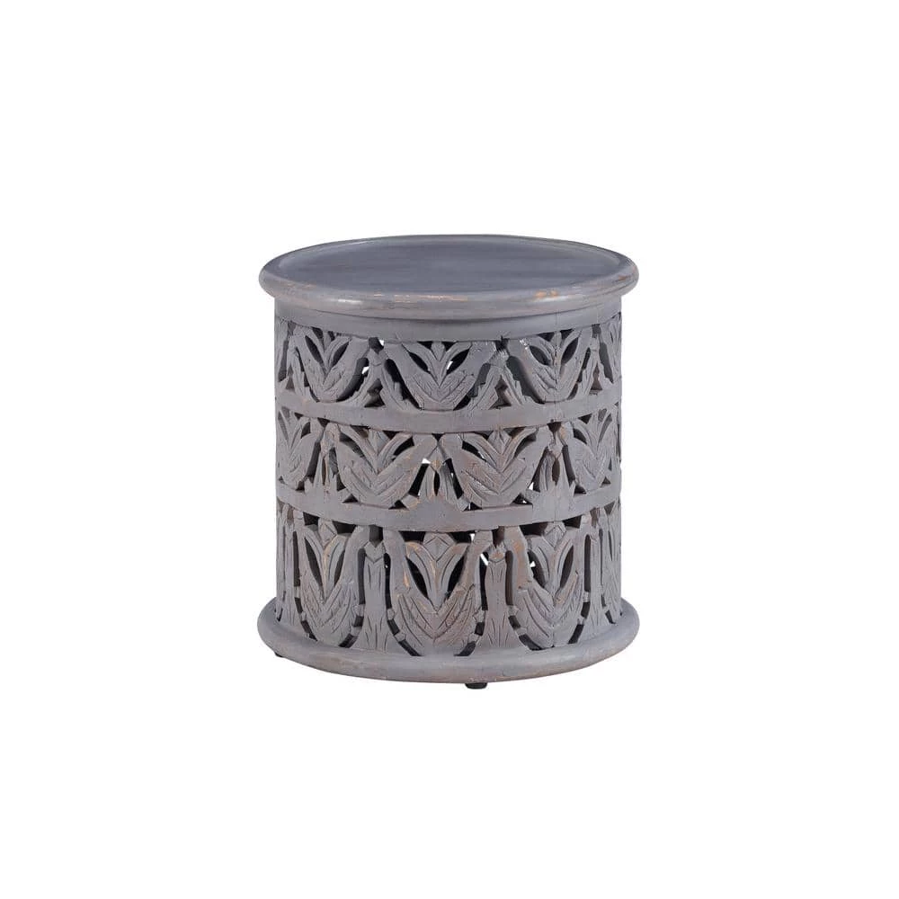 Bring new visual intrigue into your home with this hand carved Serena Light Gray Side Table. The round silhouette offers a welcome contrast to the angular elements typically found in a space. Use it in any room to hold a lamp, set drinks down, or display your favorite photos. The carved bird design in the sides introduces a bit of boho style and a beautiful texture that is sure to catch the eye. Made of solid mango wood and sealed with a glossy lacquer finish, this sturdy piece arrives fully assembled and is built to last.