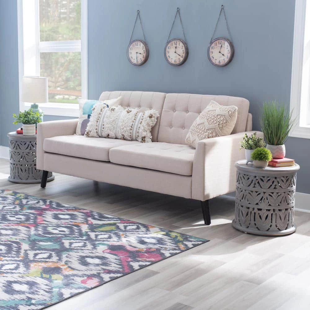 - Light grey wash finish offers a neutral accent that pairs seamlessly with a variety of decor