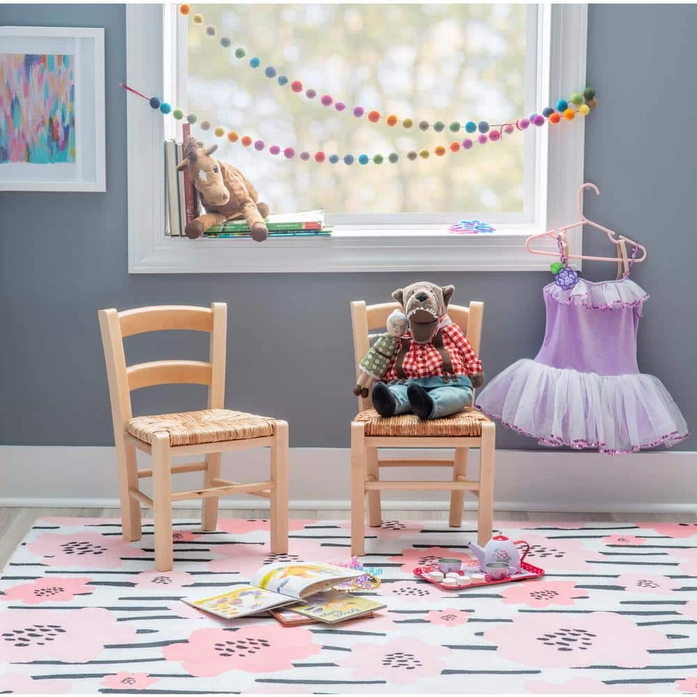 Your littles ones will spend hours creating, learning, and playing in these Sophie Black Wood with Woven Rush Seat Kids Chair (Set of 2). The craftsmanship of the woven rush seat presents a timeless texture. Rush seating is known for being durable and versatile with many types of decor styles. It complements the smooth frame, with a slight arch in the back for a whimsical touch. Made of solid wood, the chair provides sturdy support while still being mobile for your playroom, and the natural finish showcases the beauty of the wood grain.