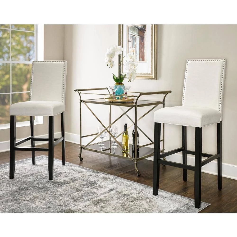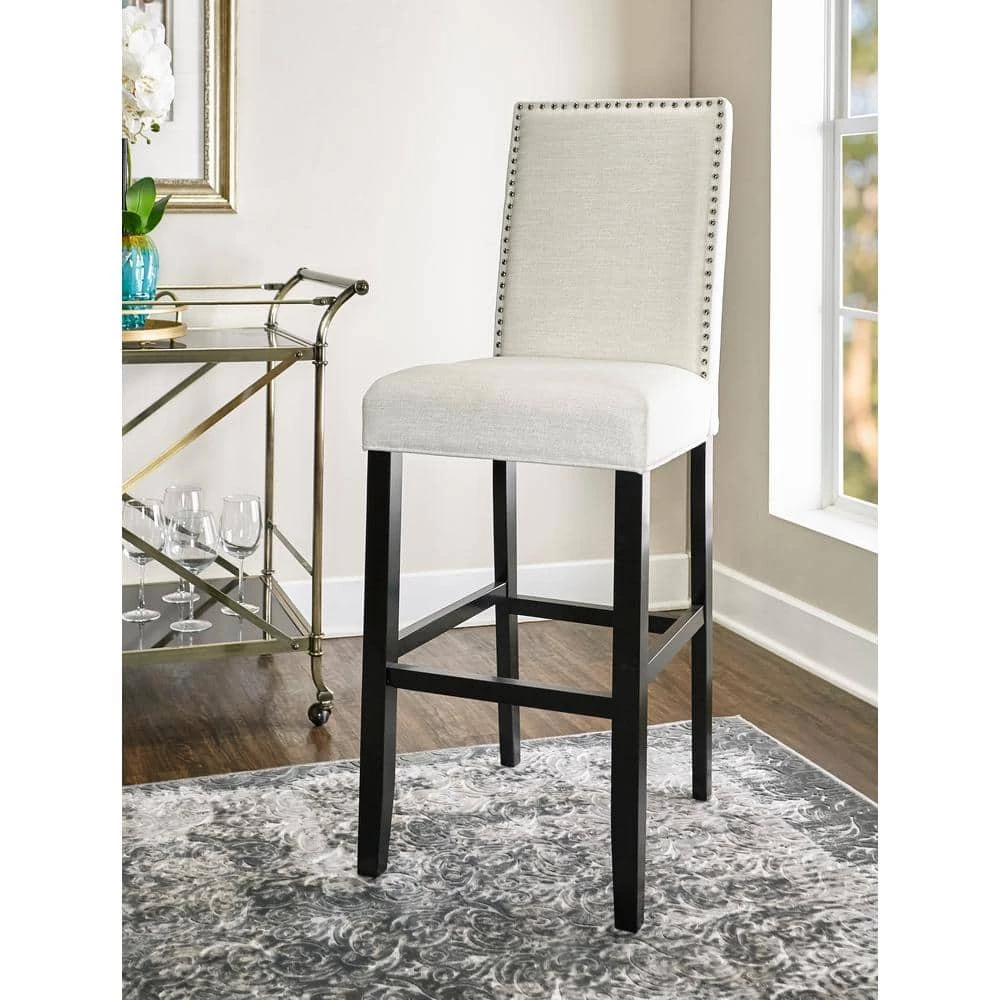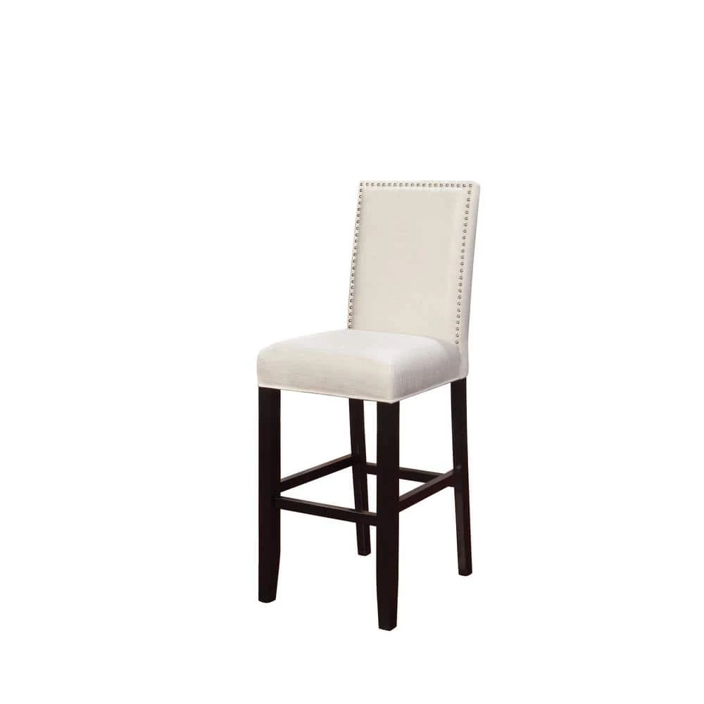Upgrade any counter seating area with the Stewart Bar Stool. This stool features a full back, which provides total comfort. It features a modern style, adding a contemporary element to any seating area. It has an armless design, so you can push it under the table or bar. Coming with a wooden frame, it is easy to maintain and creates a homey, aesthetically appealing look. This stool features a vinyl seat, which resembles the look of leather yet is particularly easy to maintain. This white stool perfectly contrasts with darker interiors and will be great for achieving a monochromatic color scheme in the room. It is outlined with nailhead trim, accenting the stool with some shiny contrast for a sophisticated design. This stool has a foot rest, ensuring a more ergonomic design and promoting good posture.