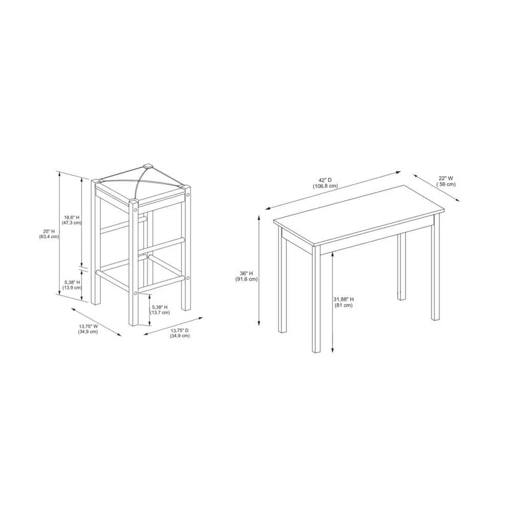 - Includes rectangular table and 2 backless counter stools