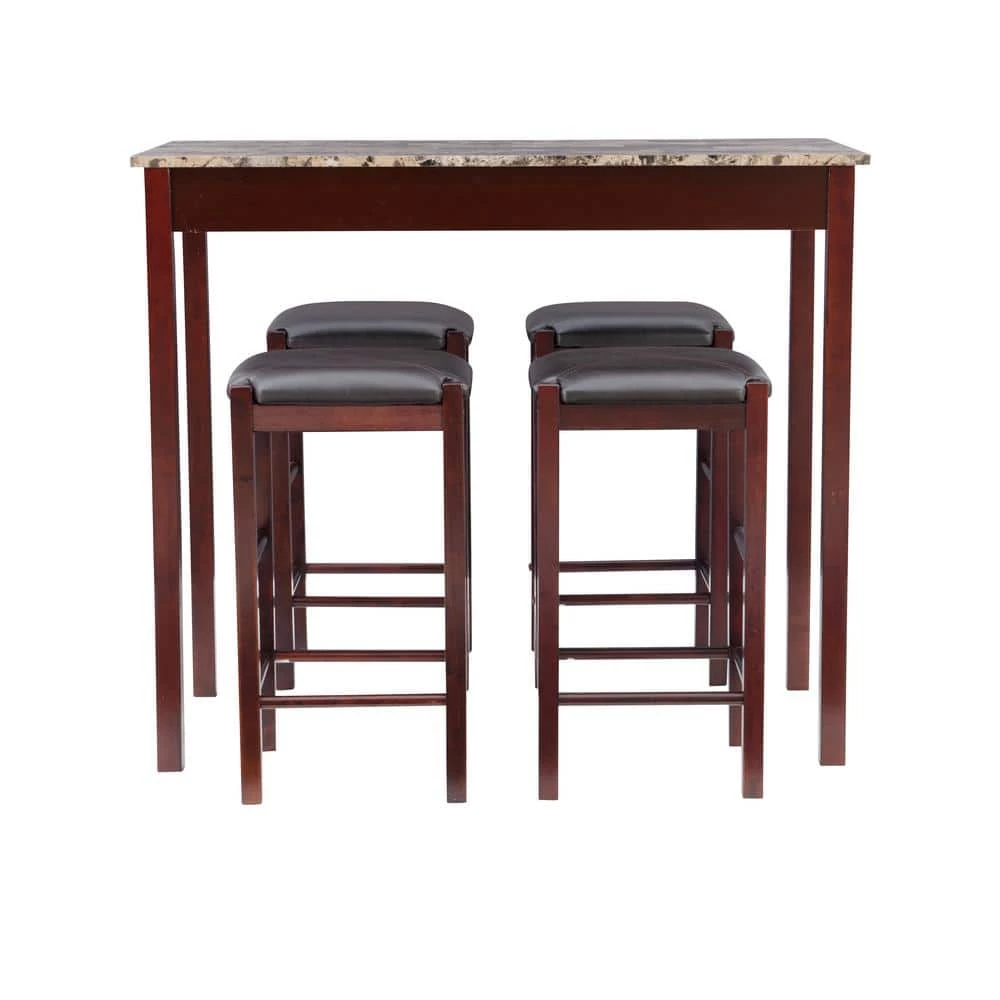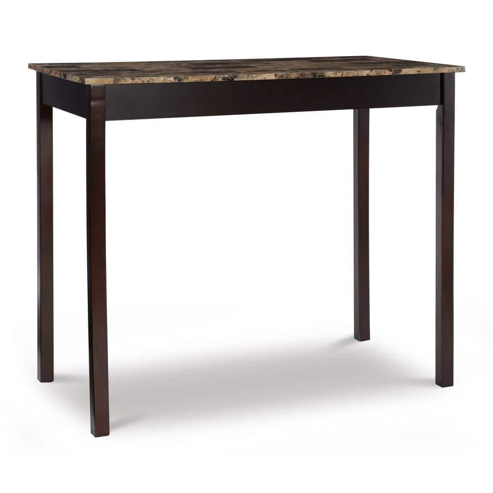 Tahoe Espresso 5-piece Tavern Set with space saving convenience. This set features a simple rectangular table on long sturdy legs with 4 backless counter height stools with padded, black vinyl seat covers. Made from solid woods and a faux stone paper wrapped top. The rich Espresso finish gives this piece an elegant and sophisticated appeal. The stools tuck neatly under the table when not in use. Stools 13.75 in. x 13.75 in. x 24 in. Stool weight limit is 275 lbs.