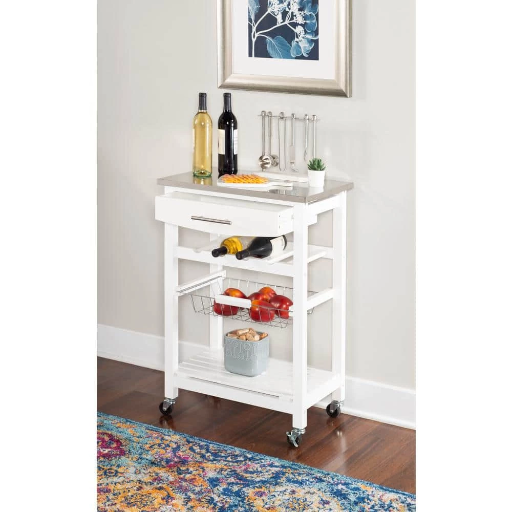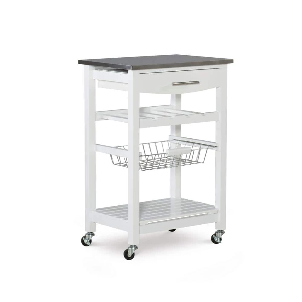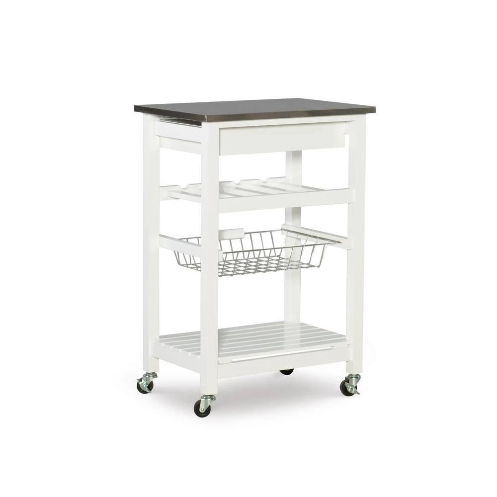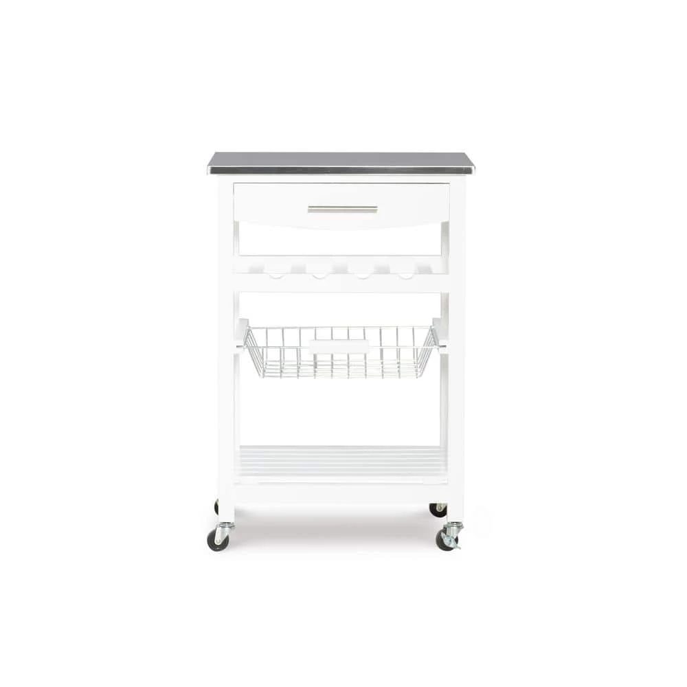 Expand your kitchen workspace with the Clarke Kitchen Cart. A single pull out storage drawer, wire basket, wine bottle storage rack and single shelf, provide ample storage space for all of your kitchen essentials. Durable castors make for easy mobility throughout your space and lock for safety. The neutral white finish easily blends with any existing kitchen decor. Ideal for small spaces.