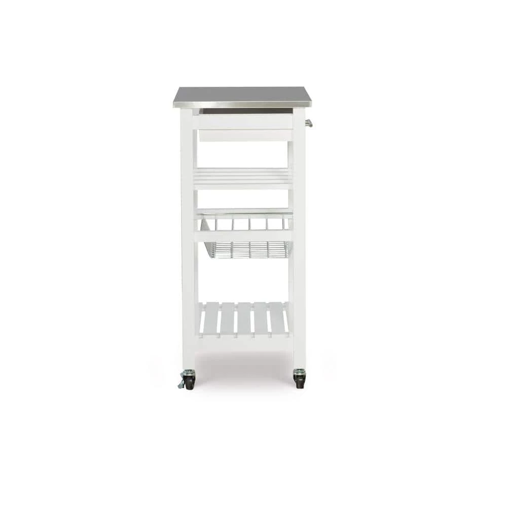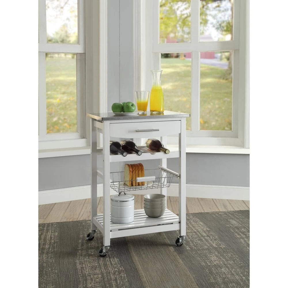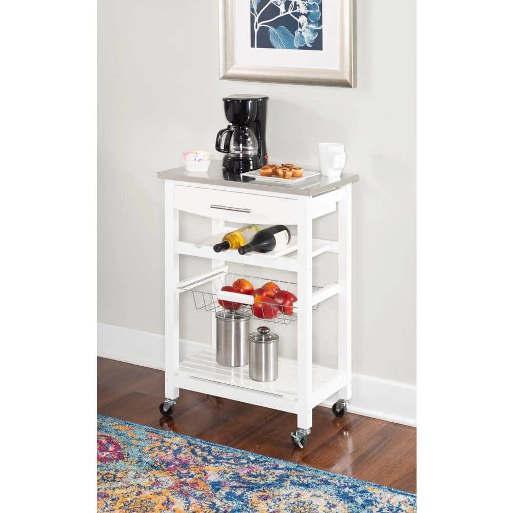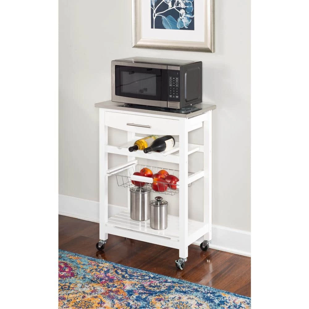 Expand your kitchen workspace with the Clarke Kitchen Cart. A single pull out storage drawer, wire basket, wine bottle storage rack and single shelf, provide ample storage space for all of your kitchen essentials. Durable castors make for easy mobility throughout your space and lock for safety. The neutral white finish easily blends with any existing kitchen decor. Ideal for small spaces.
