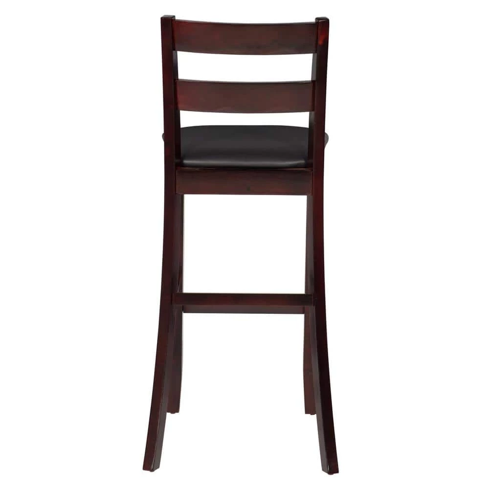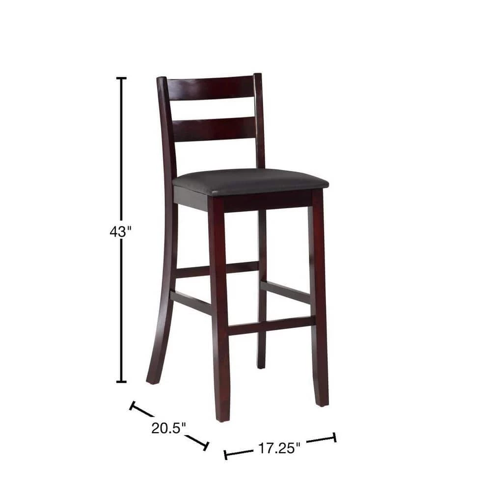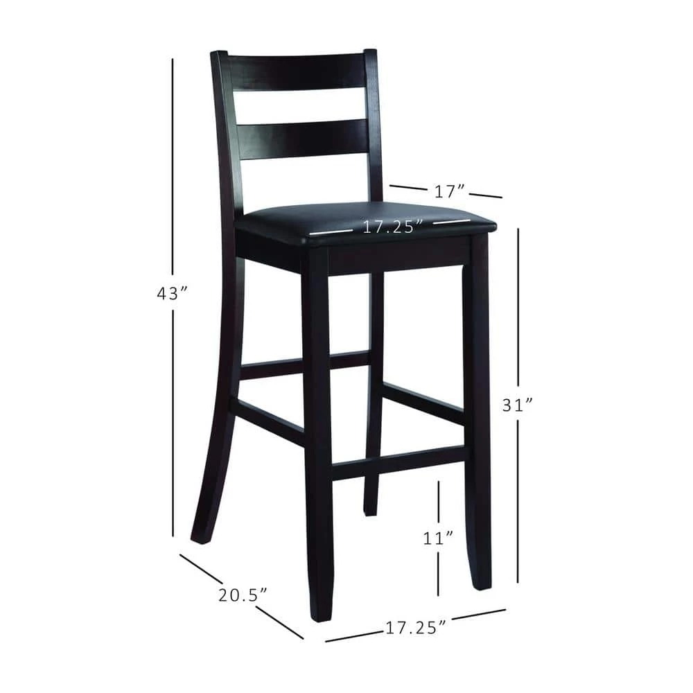 With traditional styling, this Toro 43 in. H Espresso Ladder Back Wood 31 in. Seat Height Bar Stool with Padded Faux Leather Seat will enhance your dining area with its casual charm. The rich espresso finish, dark brown wipe clean vinyl padded seat, and 30 in. high seat give this bar stool a timeless allure. Solid construction and quality craftsmanship have made this bar stool both sturdy and attractive. This bar stool fits beautifully into a casual or formal decor. 275 lbs. weight limit.