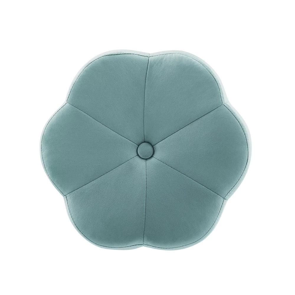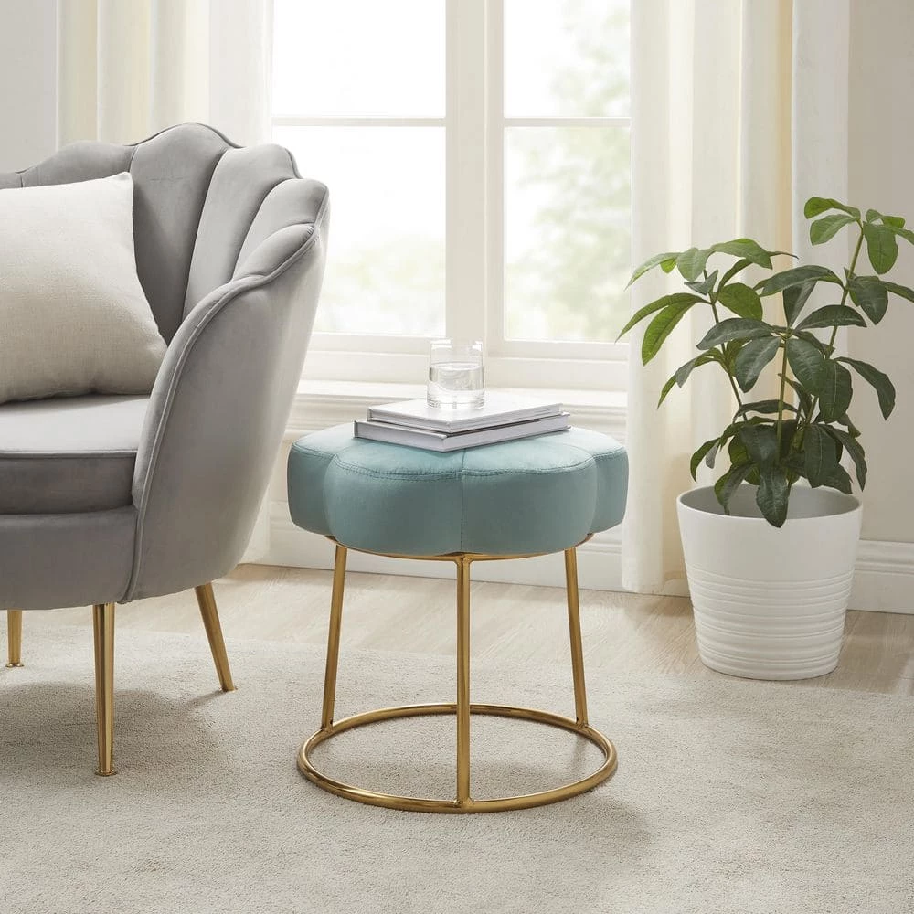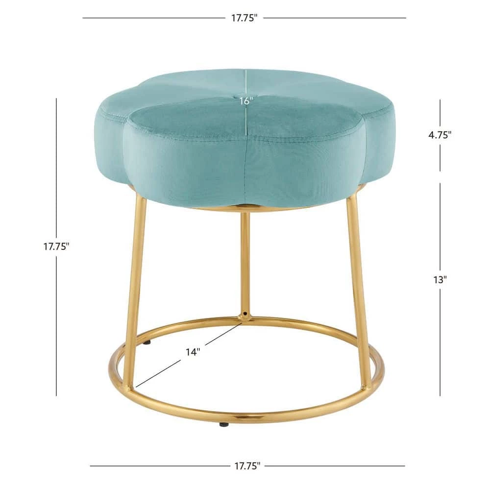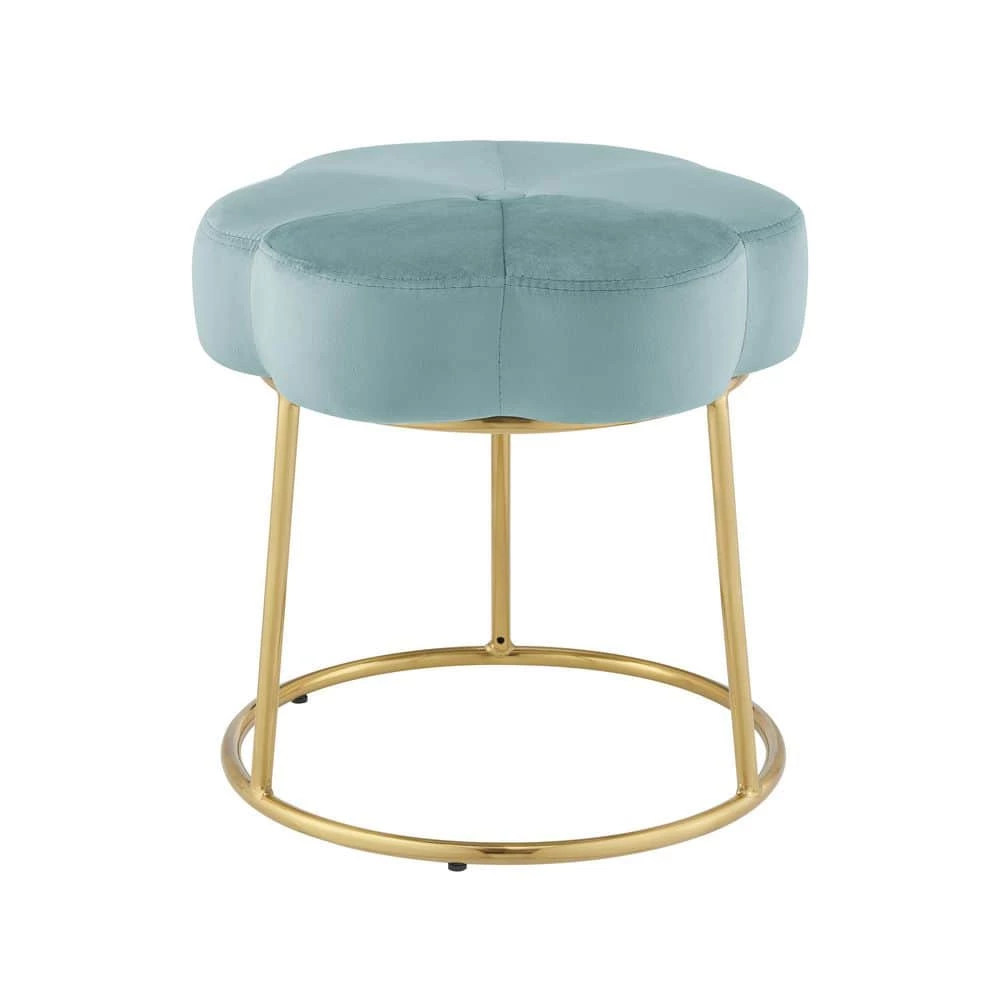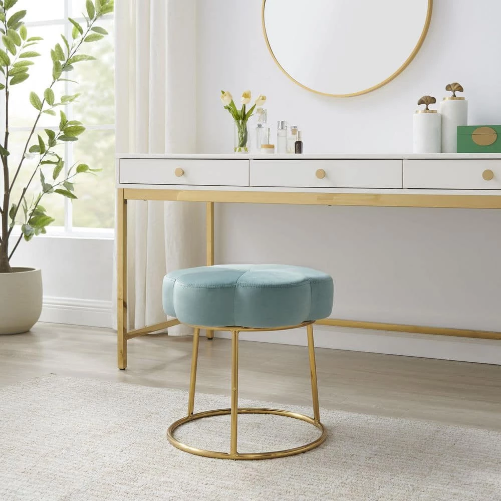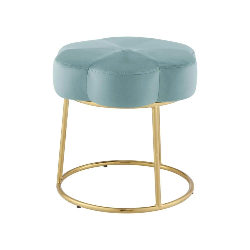 Inspired by boho design, a perfect pairing of minimal lines while still conveying a luxurious style. Plush light teal velvet is used to create this subtle floral shape that offers soft padding for comfort. The foundation is an elegant gold color plated base. Sitting 17.75 inches off the floor, this comfortable stool can fit under a make-up vanity, bathroom prep table, desk, or anywhere. Adds a welcomed pop of color to any room. Multiple colors to mix and match.