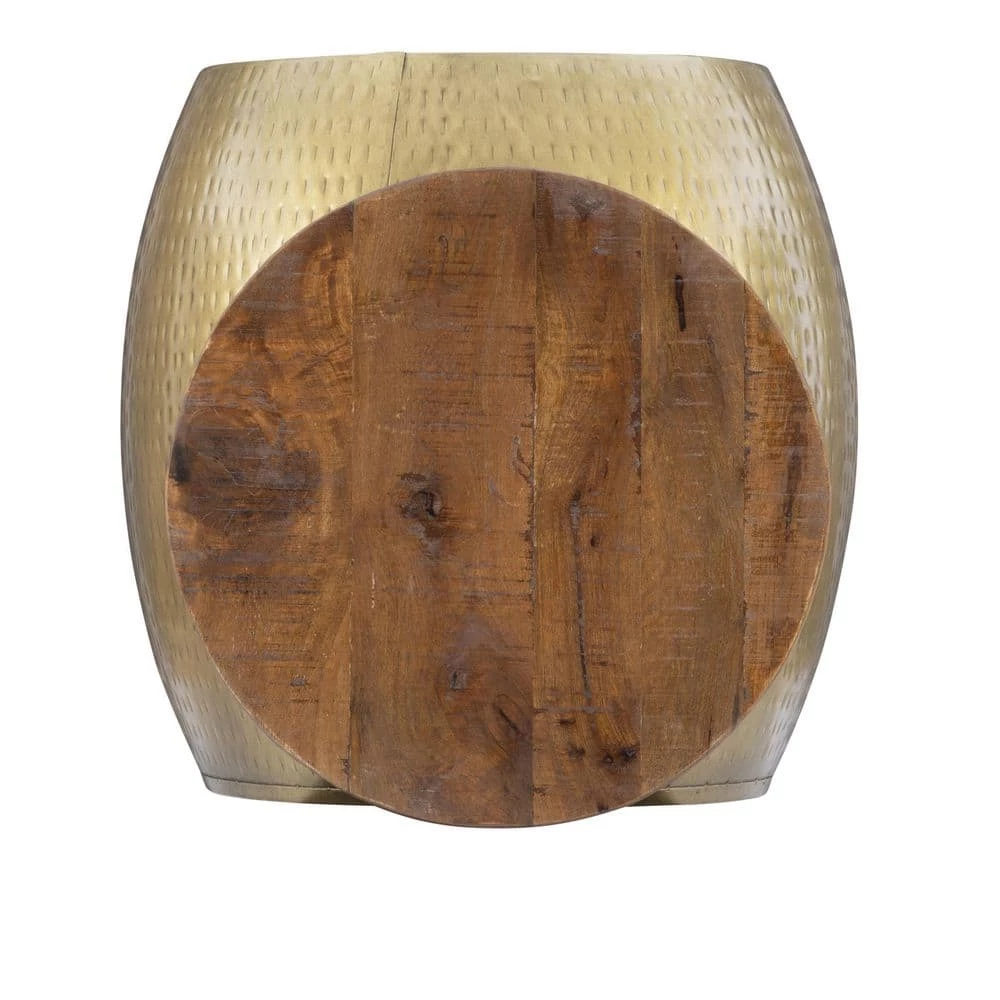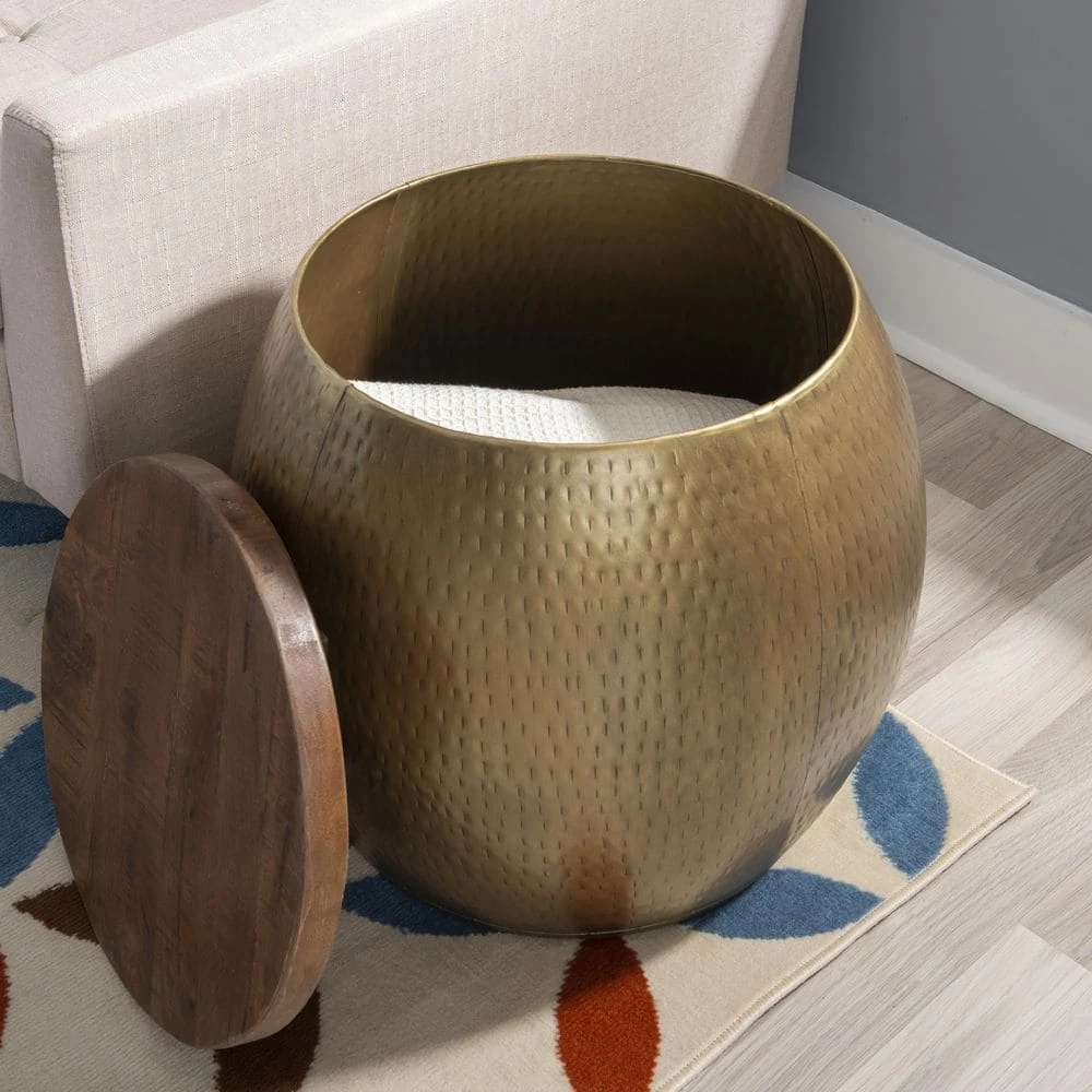 Add a touch of elegance to your home with this Wagner Gold Drum Side Table with Storage. Handcrafted in India, the muted brass finish of the metal body and rich texture of the solid wood lid create a rustic, eye catching contrast. The lid lifts off to reveal hidden storage, perfect for e x tra blankets, pillows or rogue remote controls. Measuring 19 in. from the ground, this versatile accent piece doubles as a small table and subtle storage that fits wonderfully next to a couch or set of chairs.