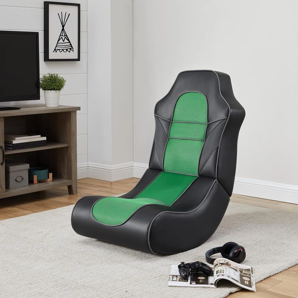 Zone into your favorite video game or doze off on a midday nap with this Walter 34.5 in. Green and Black Faux Leather and Mesh Rocking Gaming Chair. The comfortable padded shape is ideal for relaxing, whether you’re stationed in front of a television for an extended gaming session, snuggled up with a book or centering yourself in meditation. The faux leather upholstery with a green mesh center strikes a modern tone and is easy to maintain with just a damp cloth. With a compact design, this chair is ideal for extra seating during sleepovers, group projects in a dorm room or as a front row seat in your home entertainment space.
