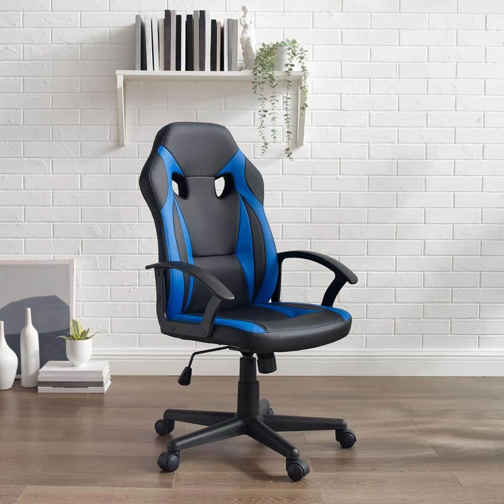 Whether you’re strapping in for an all nighter or just dropping by for a quick round, this Walter Black/Blue Faux Leather Gaming Chair with Arms provides all of the necessary ergonomic support and mobility to keep you in the zone. The high backrest and foam seat cushion are upholstered in blue and black faux leather upholstery for extra comfort, easy cleaning and a bit of pizazz. Adding to overall convenience is a gas lift that allows for seamless height adjustments as well as holes in the headrest for extra ventilation and the option to attach a pillow.